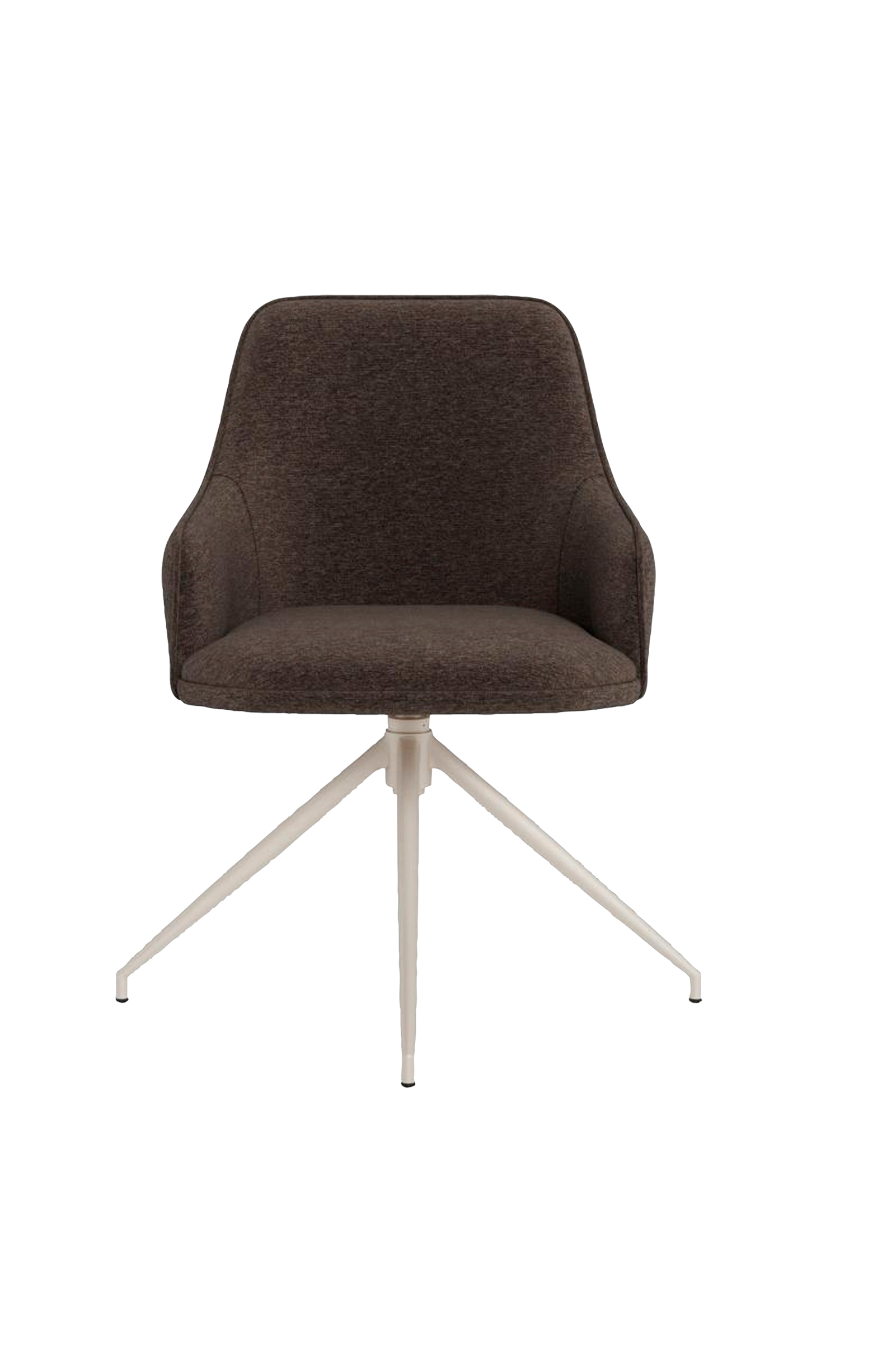 Tämä moderni, käsinojilla varustettu ruokailutuoli, jossa näkyy sen chenillekangas, sopii helposti ruokailutiloihin, joissa tyylillä on väliä. Istuinta tukee jalusta, jossa on kääntötoiminto, joka mahdollistaa istuimen helpon liikuttelun.