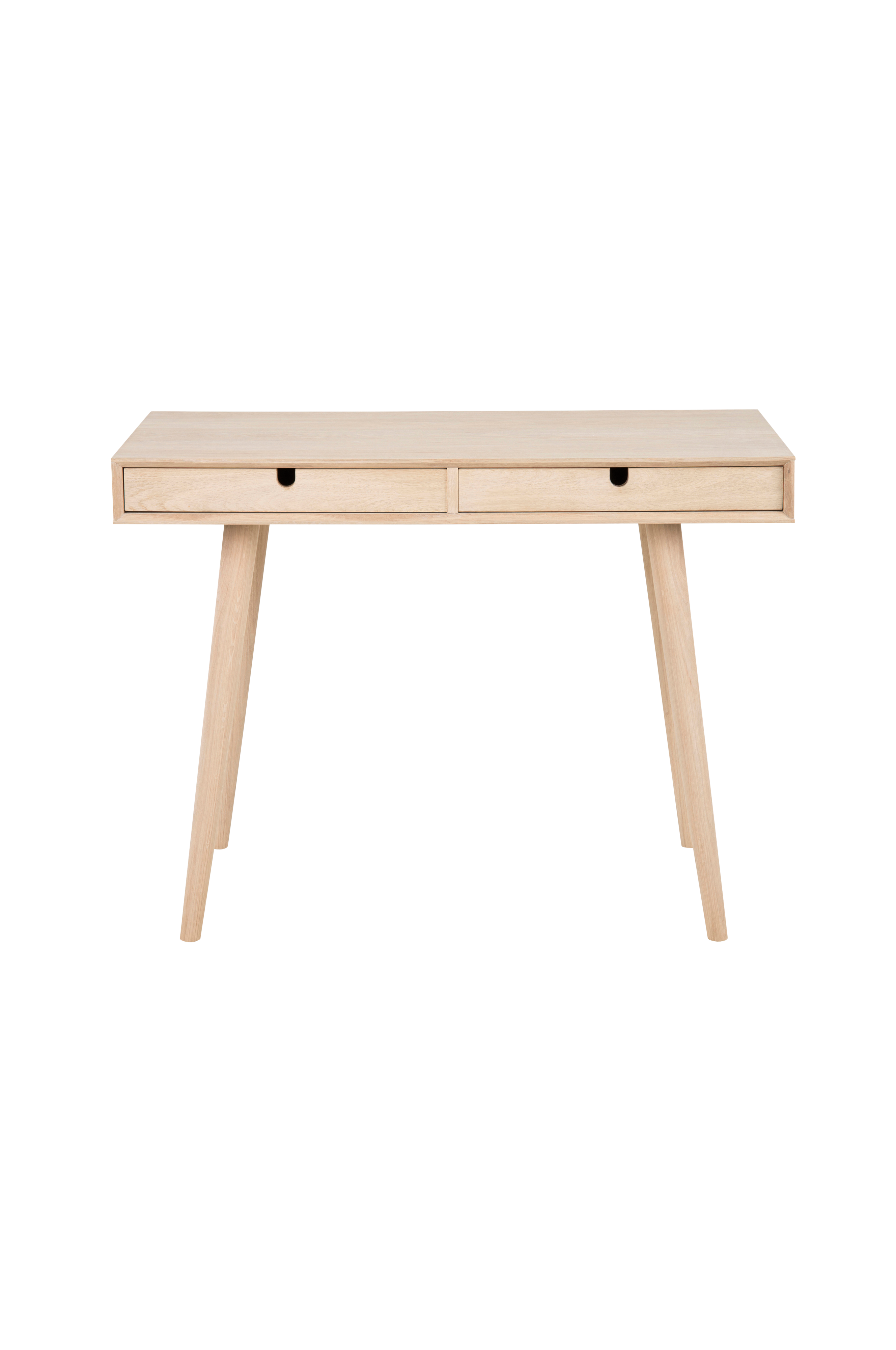 Kirjoituspöytä. Valkopigmentoitua tammiviilua. 2 laatikkoa. Leveys 100 cm, syvyys 45 cm, korkeus 74 cm. Toimitetaan osina.