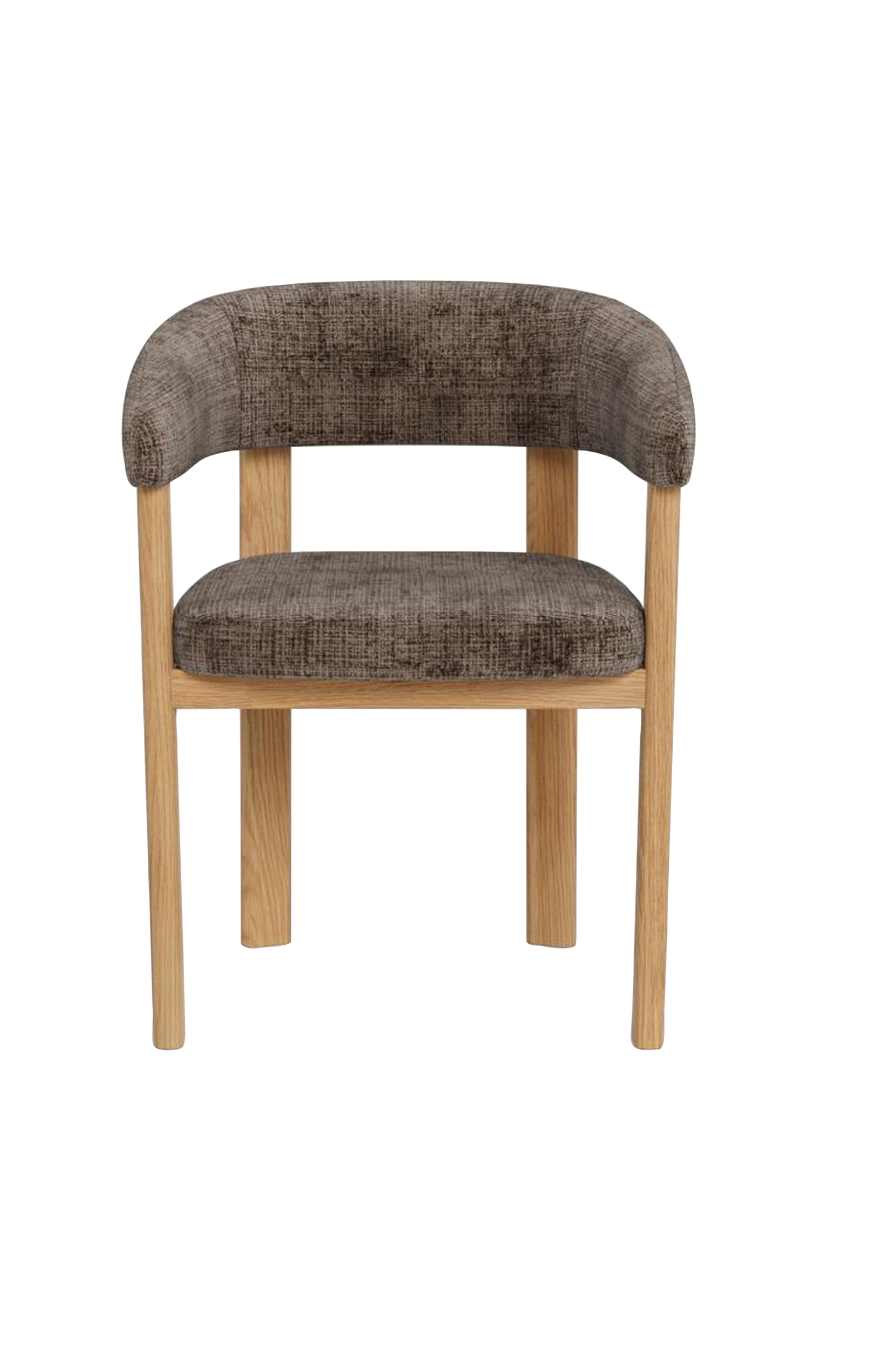 Tämä nykyaikainen ruokailutuoli käsinojilla edistää pehmeää pohjoismaista estetiikkaa. Sen sirosti kaareva siluetti tukeutuu leveään, tyylikkääseen tammirunkoon ja -jalkoihin, jotka tarjoavat sekä lämpöä että rakennetta, kun taas hellävarainen mutta väriltään elinvoimainen verhoilu luo visuaalista juonittelua. Tästä kappaleesta tulee jokaisen ruokailutilan kohokohta.