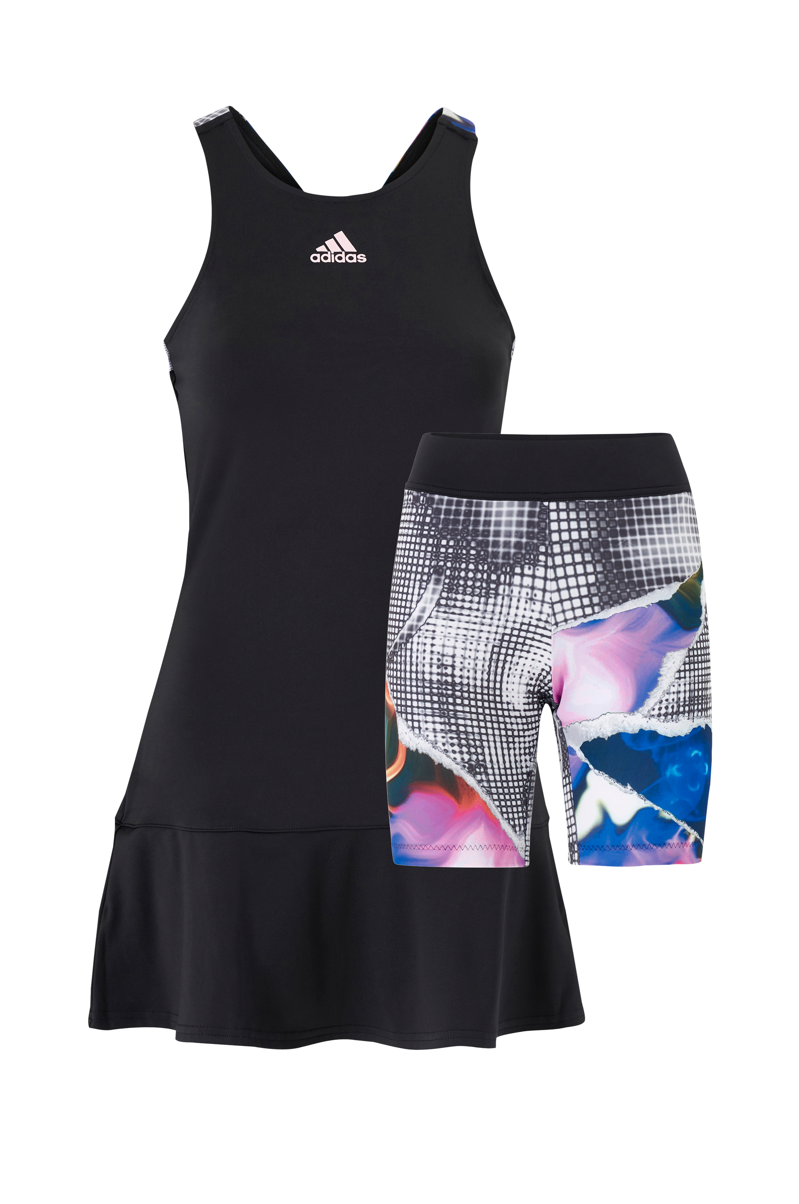 - Kapea istuvuus- Pyöreä pääntie, jossa V-muotoilu selässä- Pehmeää ja joustavaa materiaalia- Kosteutta imevä AEROREADY- Lyhyet sisätrikoot, jotka menevät hameen alle- Grafiikka uloimmissa olkaimissa ja trikoissa