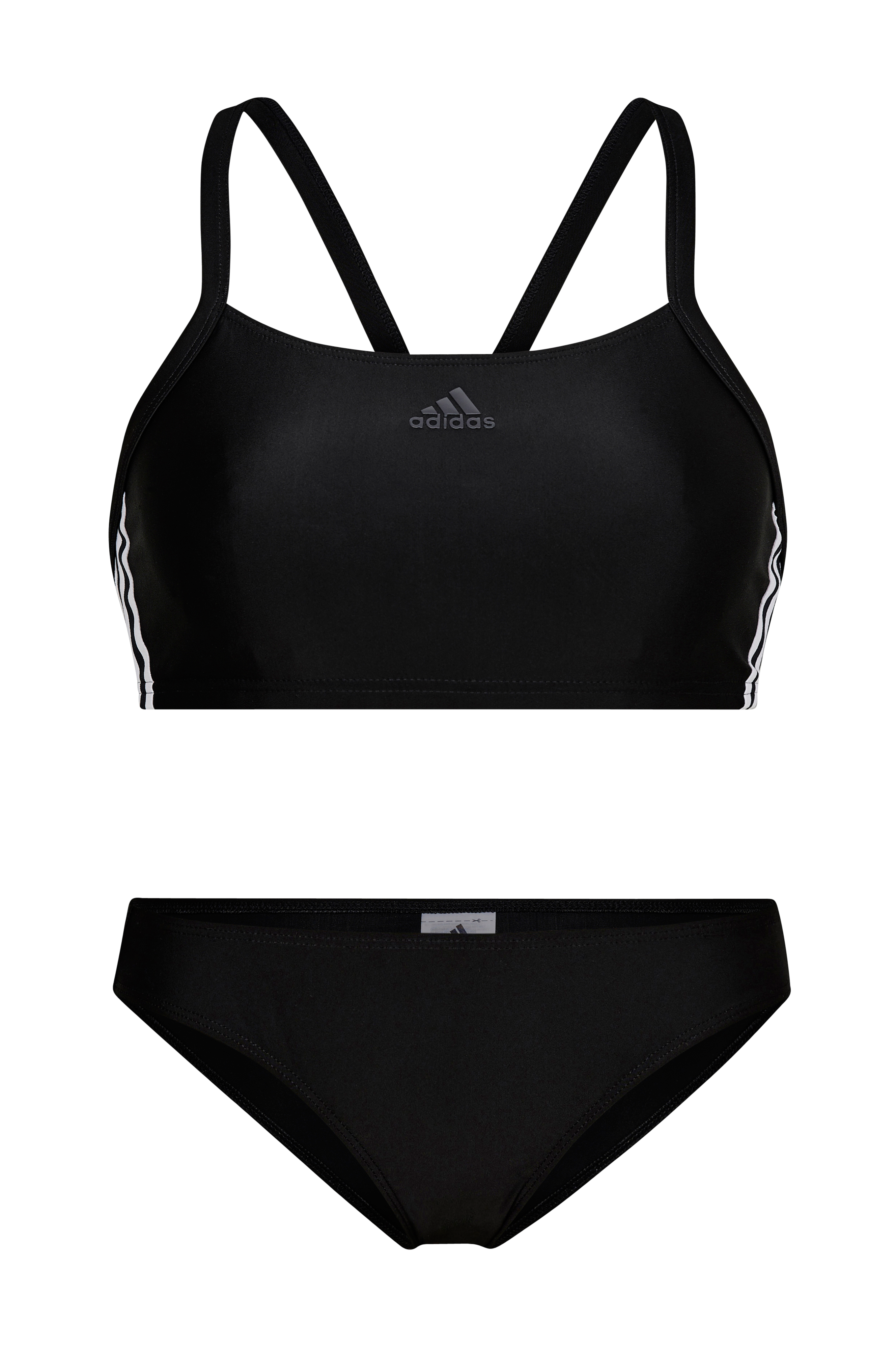 Adidas Sport Performance Fit 2PC 3-Stripes -bikinit kloorinkestävää Infinitex Fitness Eco -materiaalia, joka sisältää regeneroitua, kierrätetyistä kalaverkoista ja muusta nailonjätteestä valmistettua ECONYL®-lankaa. Urheilullinen malli, keskikorkeat jalantiet ja painijanselkä.