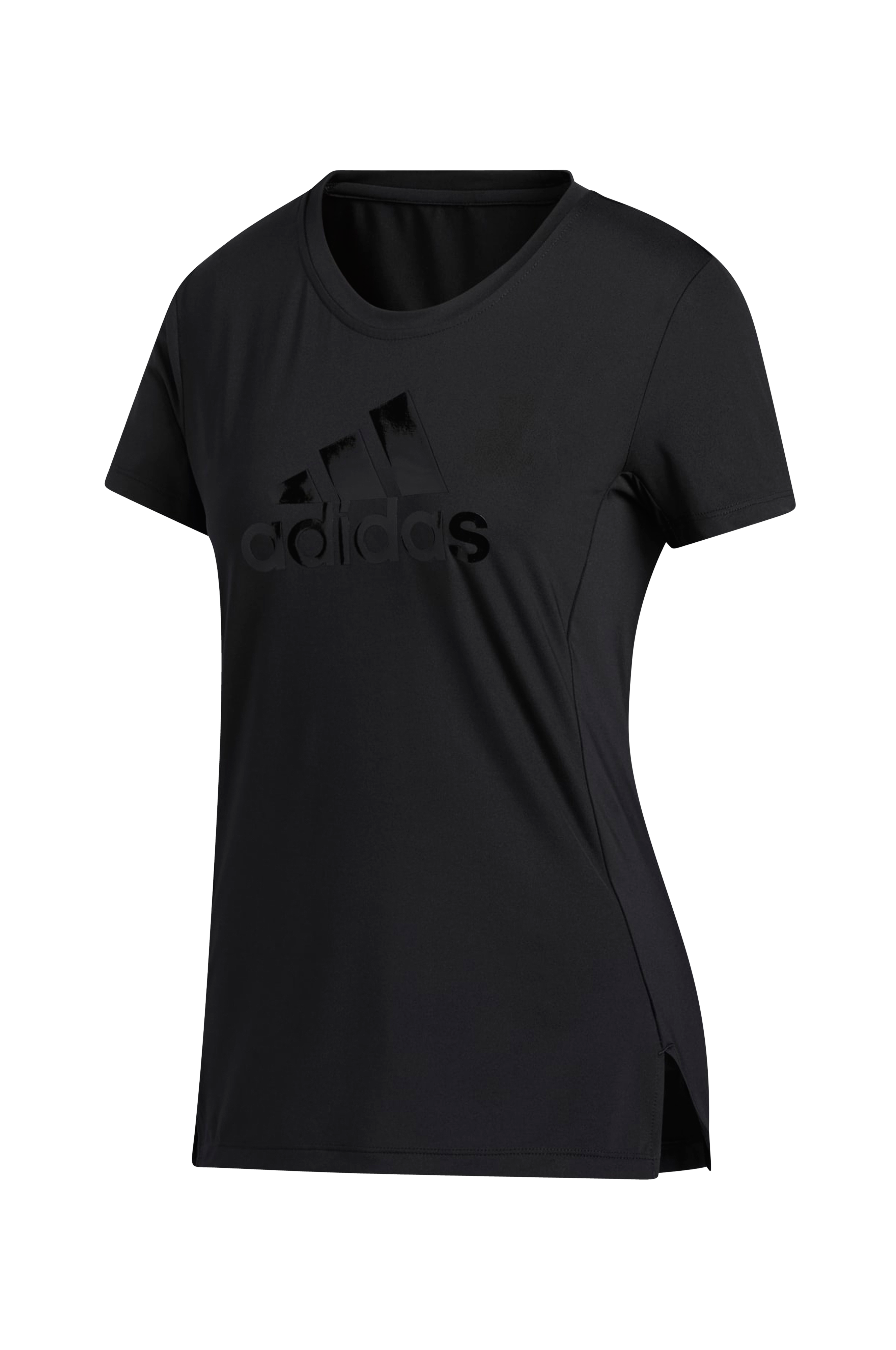 Adidas Sport Performance Glam On Badge Of Sport Logo Tee -treenipusero. Joustavaa trikoota, jossa kosteutta imevä AEROREADY. Pyöreä pääntie ja kiiltävä, musta logo edessä. Läpikuultava ja hengittävä verkkokangasupotus ylhäällä selässä. Sivuhalkiot helmassa ja pidempi takakappale, jossa pyöristetty helma.