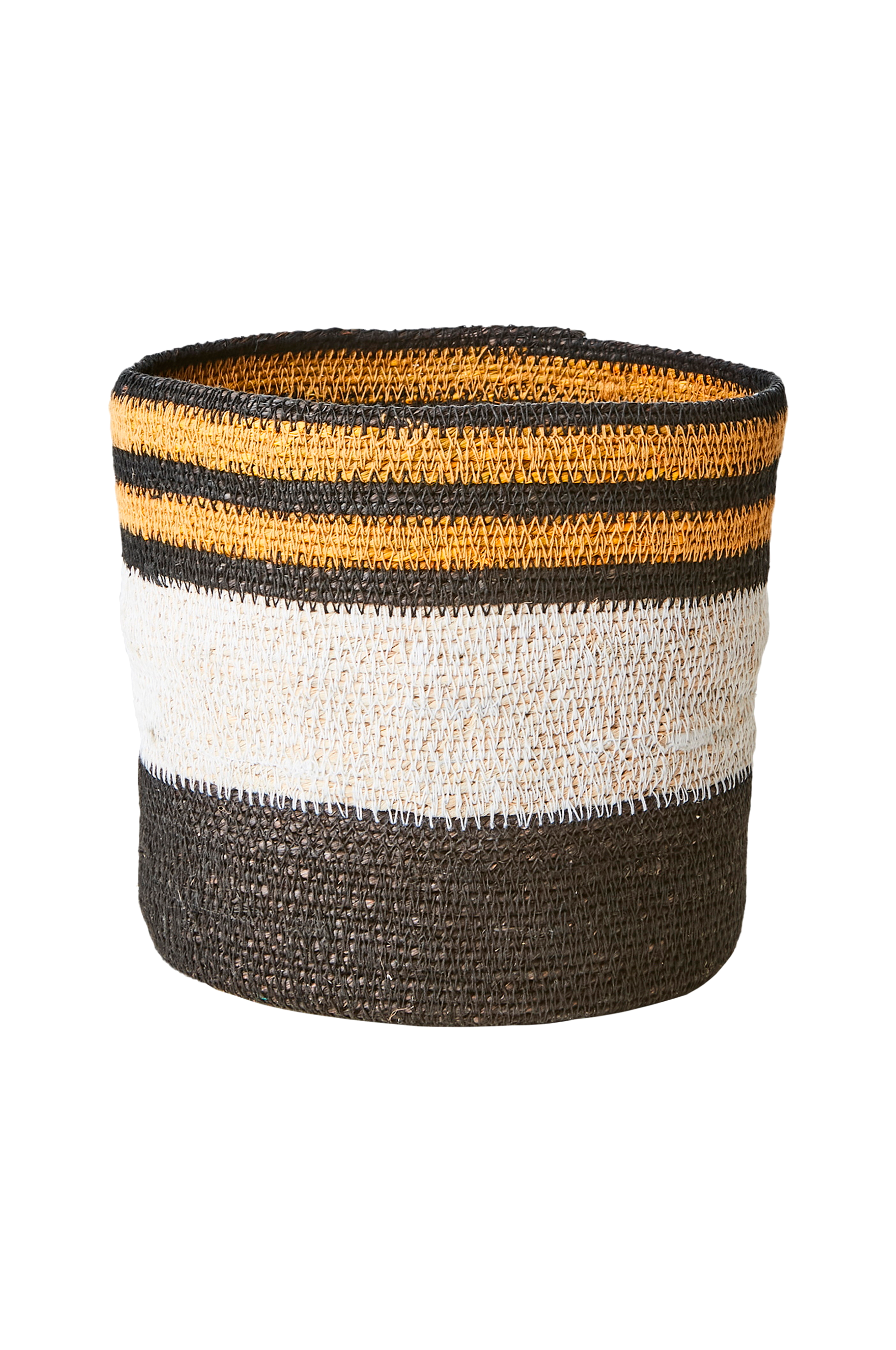 Merilevästä kudottu kori, jossa on kaunis maalattu kuvio.