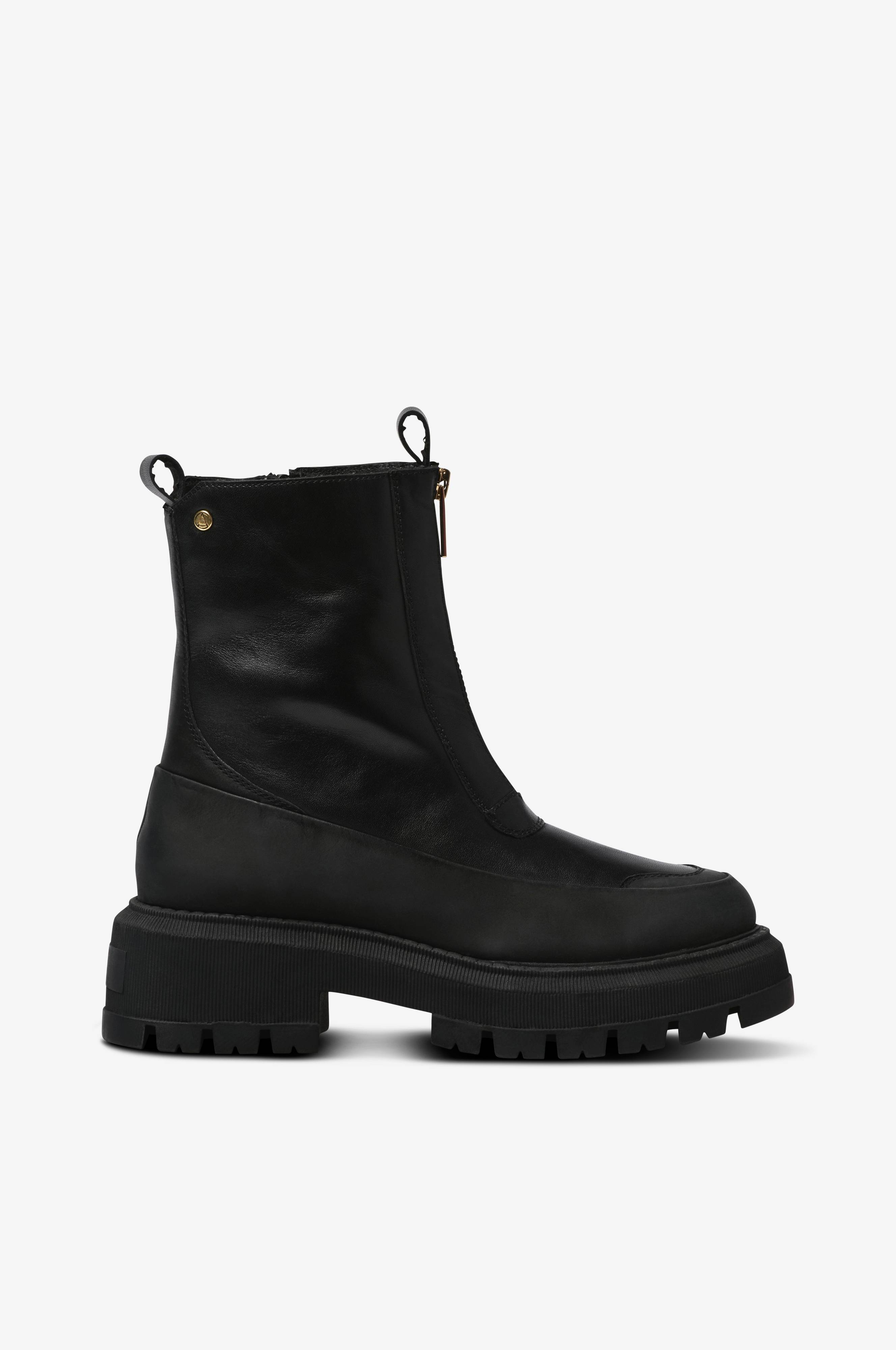 Matta- ja kiiltäväpintaisen nahan tyylikäs yhdistelmä. Koristevetoketju edessä (ei avattava) ja avattava vetoketju varren sisäsivulla. Lenkki takana ja edessä. Korkea, paksu pohja.