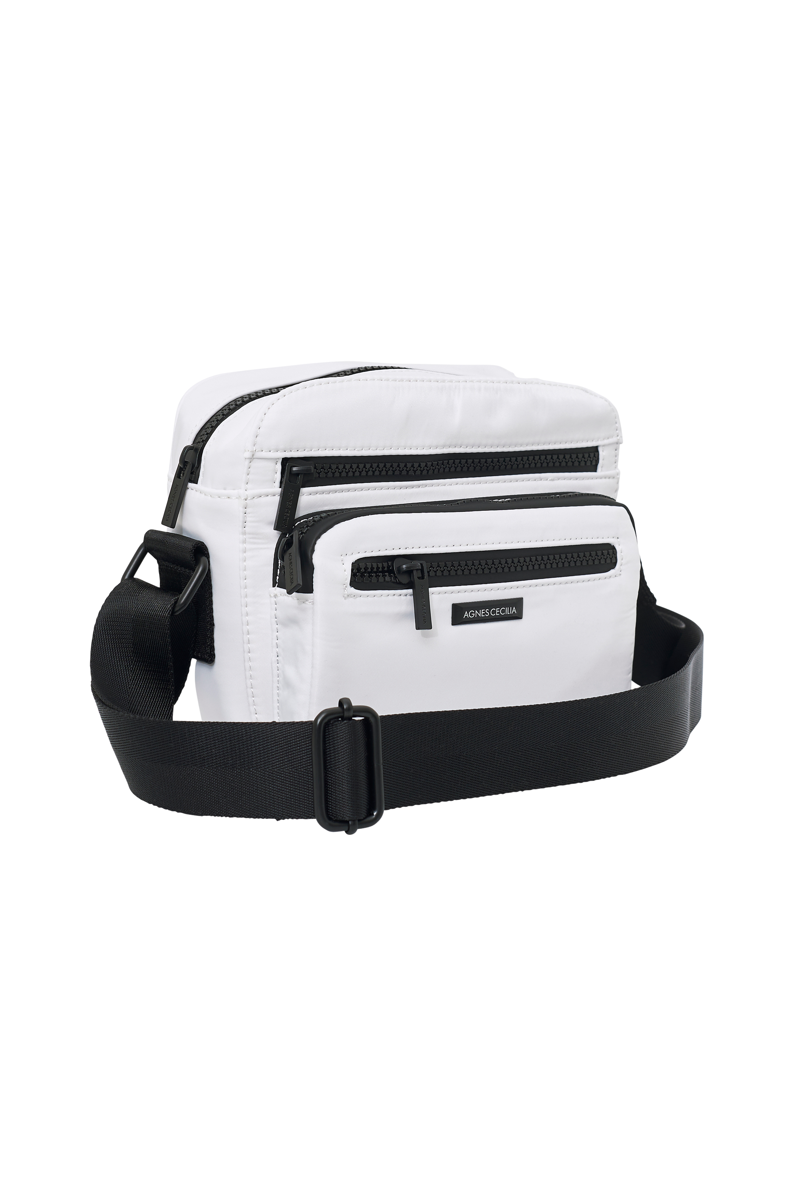 Kangaslaukku, jossa kangasvuori. Kolme vetoketjullista ulkotaskua. Päälokero suljetaan vetoketjulla. Sisäpuolella vetoketjutasku. Säädettävä olkahihna. Mitat noin: K 16 x L 20 x S 10 cm.