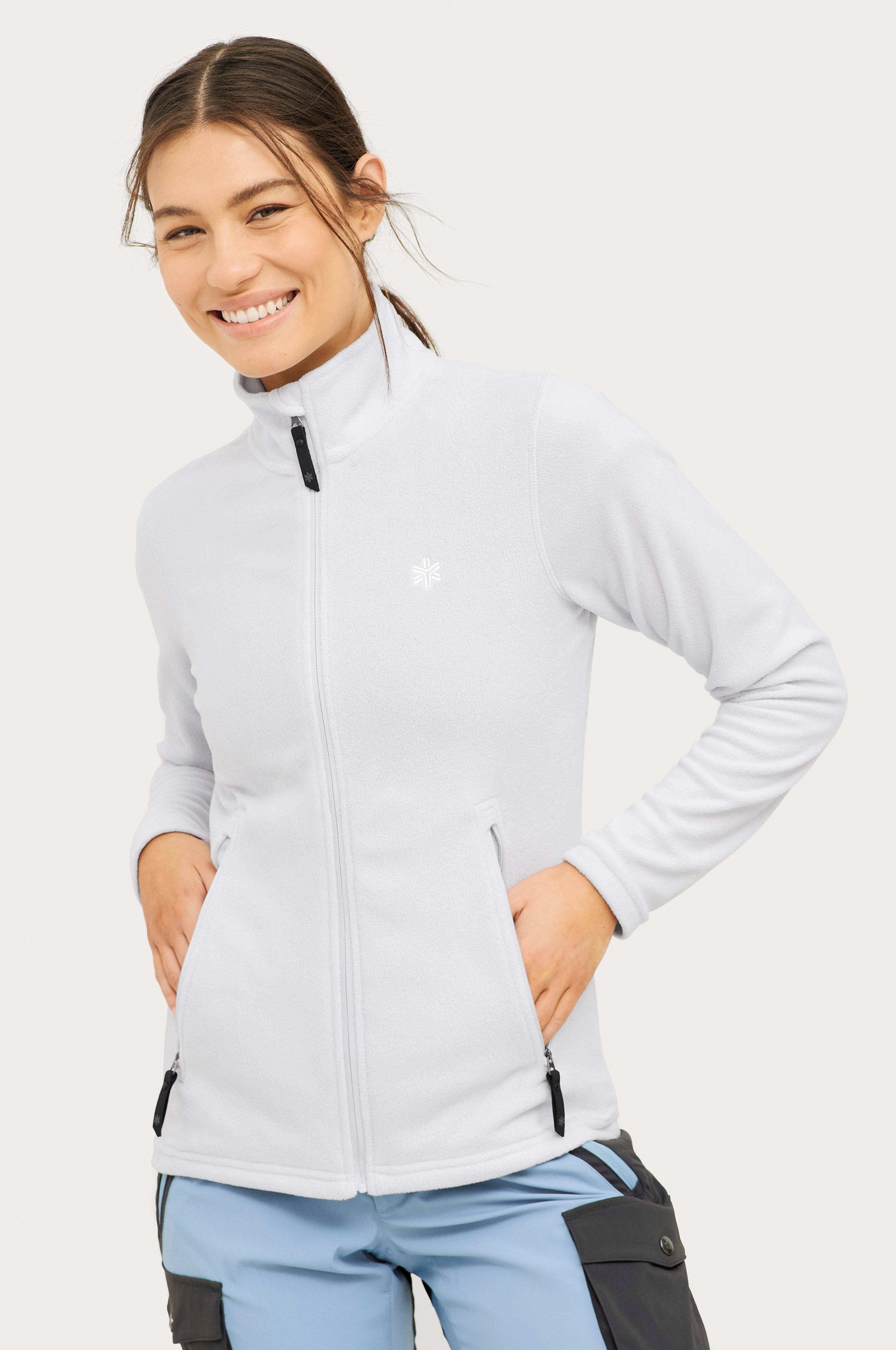 Joustava Áhkká-fleecetakki lämmintä ja kosteutta siirtävää mikrofleeceä. Pehmeä sisäpinta. Korkea kaulus, täyspitkä vetoketju ja leukasuoja. Kaksi vetoketjutaskua. Kirjailtu logo rinnassa. Välikerrosvaate. Pituus takaa n. 65 cm koossa 34/36.