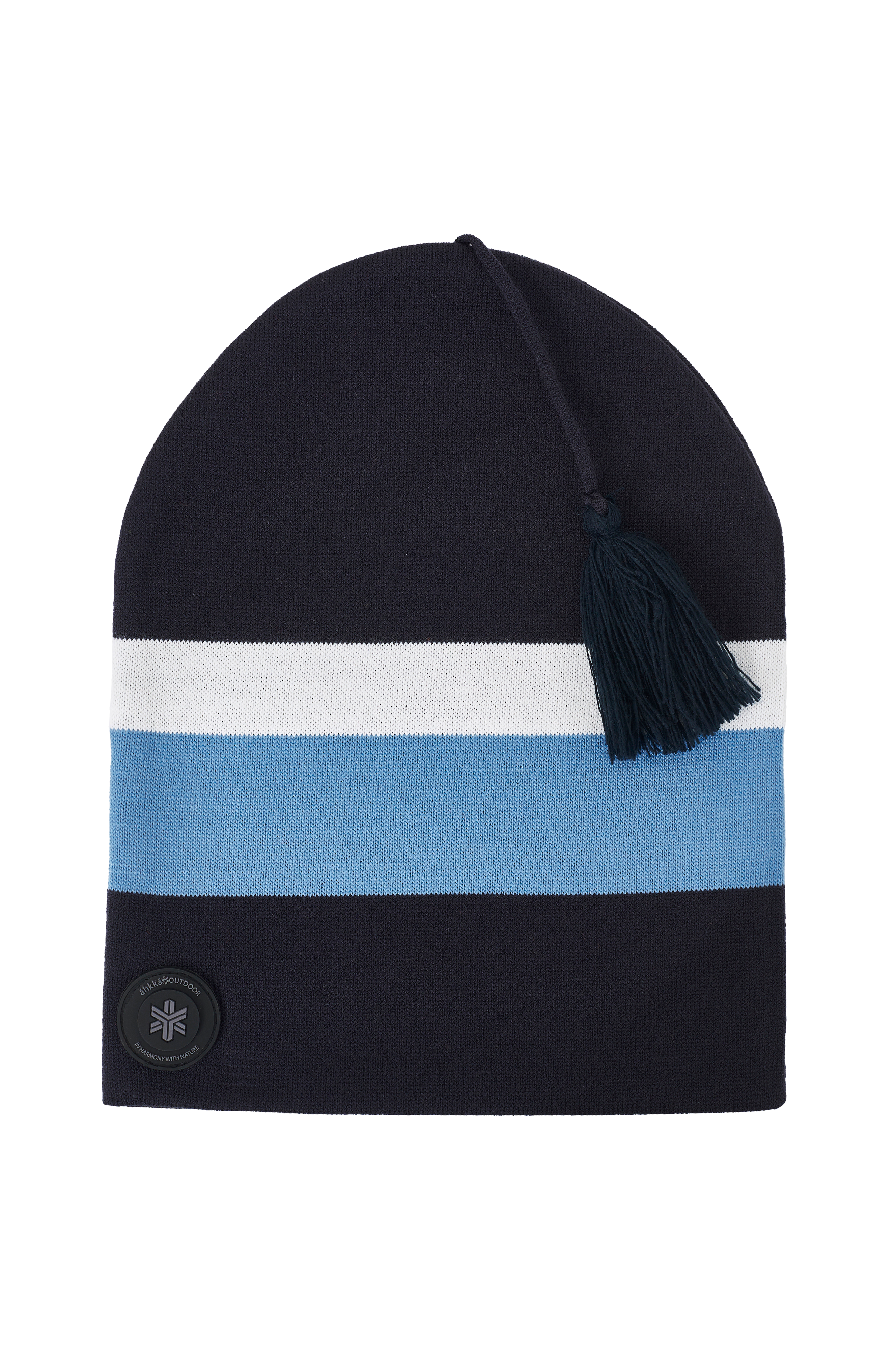 Áhkká Beanie With Stripes -pipo kaksinkertaista neuletta. Tupsu ja eriväriset raidat. Kumimerkki alareunassa. Valmistettu Ruotsissa.