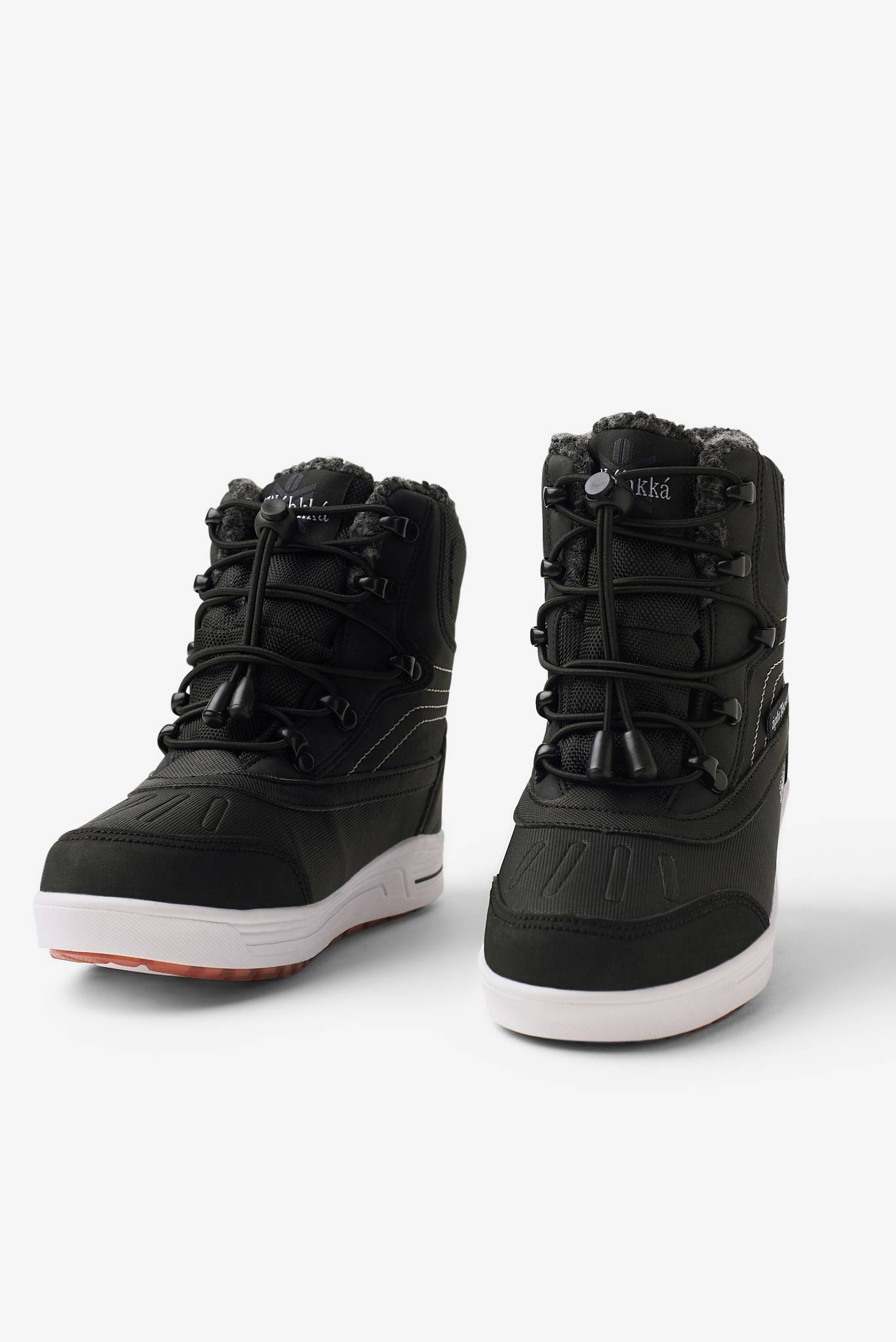 Lämminvuoriset talvikengät, joiden vedenpitävä áphiTec4.0-kalvo hengittää ja siirtää kosteutta pois. Kumivahvisteinen kärki. Pehmeä ja lämmin tekoturkisvuori. Joustava pikanyöritys ja stopperi. Kangaspäällinen, jossa nahkajäljitelmäosioita. Karkeakuvioinen ulkopohja. Varren korkeus n. 11 cm.