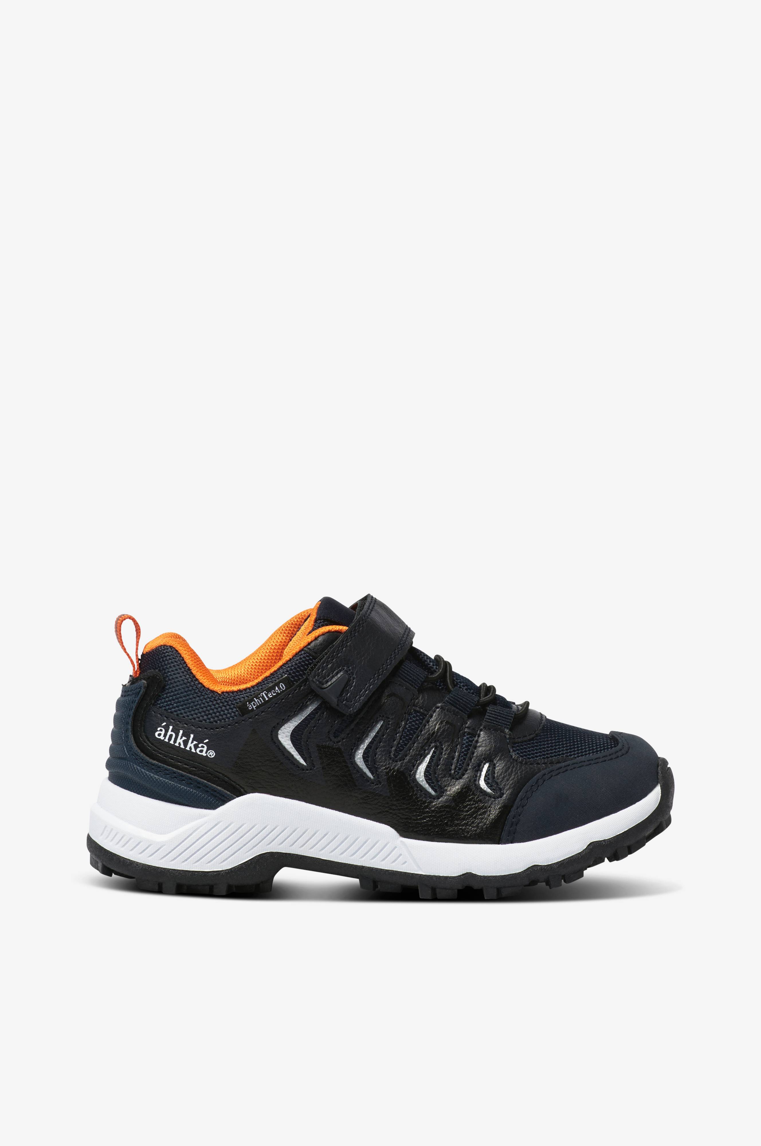 Vedenpitävät Áhkká-tennarit kangasta ja nahkajäljitelmää. Heijastinyksityiskohdat sivuilla. Kärjessä kestävyyttä parantava kumivahvike. ÁphiTec4.0-kalvo tekee kengistä täysin vedenpitävät ja hengittävät sekä siirtää kosteutta pois. Kengät on helppo pukea jalkaan joustavan pikanyörityksen ja kätevien tarranauharemmien ansiosta. Topattu varsi ja läppä. Kangasvuori. Kestävä ja pitävä kumiulkopohja.