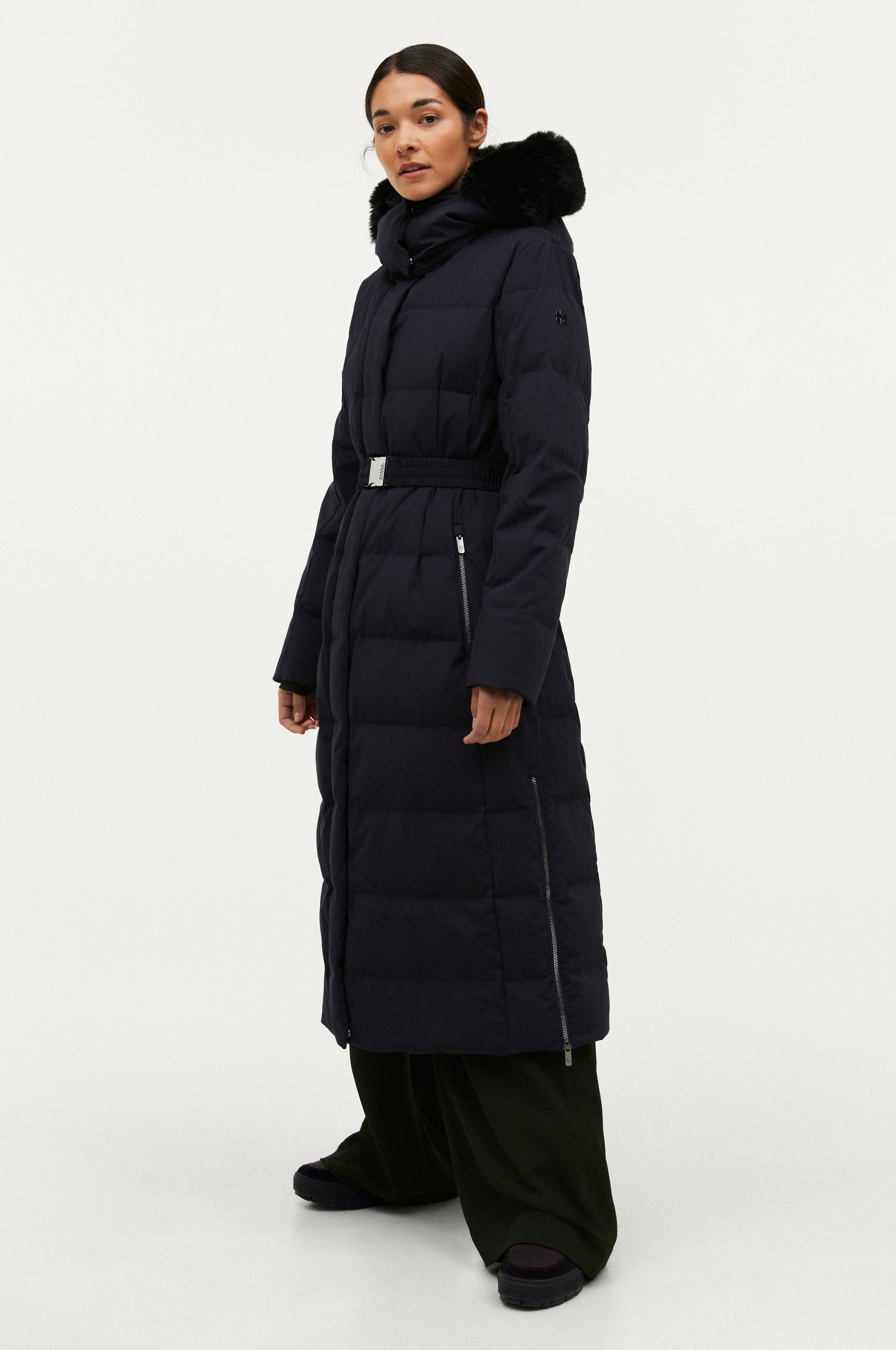 Pitkä, tikattu untuvatakki, jonka täyte 80% untuvaa ja 20% höyheniä. Fill Power 550. Takki on tuulenpitävä ja vettä hylkivä ja toimii hyvin nuoskalumessa vedenpitävän päällyskankaan ansiosta.