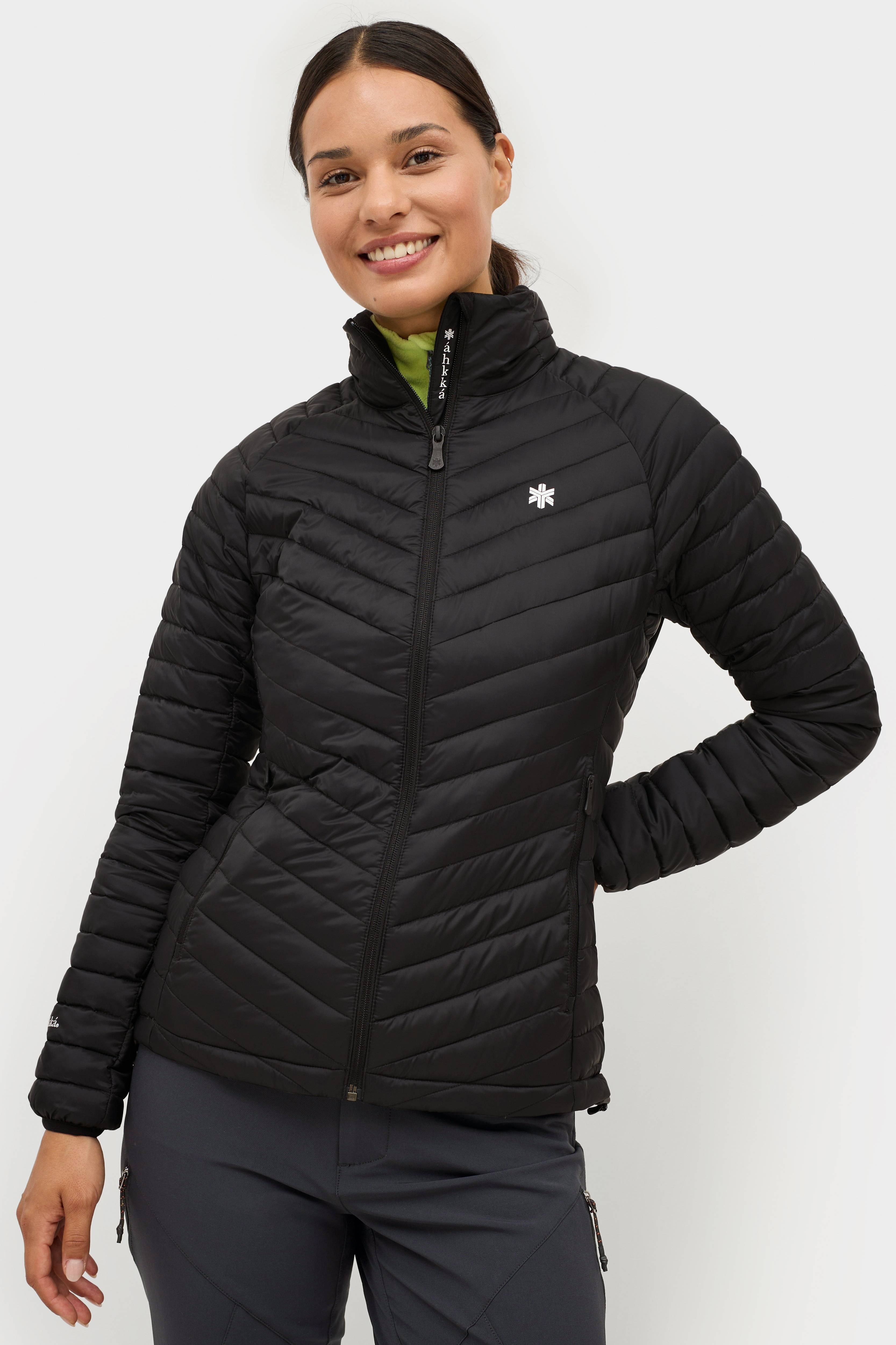 Kevyt ja kätevä tikattu Áhkká-takki, jossa täyte untuvaa ja synteettistä materiaalia - untuva on kevyttä ja lämmintä, synteettinen materiaali puolestaan kuivuu nopeasti. Fill Power 350. Pesun jälkeen takki kuivuu nopeammin kuin täysuntuvatakki, eikä täyte kasaudu paakuiksi. Takissa on kaksi vetoketjutaskua. Korkea kaulus, jonka sisäpuolella pehmeäksi harjattua polyesteriä. Vetoketju edessä ja joustavat nauhareunukset hihansuissa. Nyöri ja stopperit helmassa. Pituus takaa n. 67 cm koossa 36. Áhkká-tuotteissa ei käytetä eläviltä linnuilta nypittyä untuvaa.