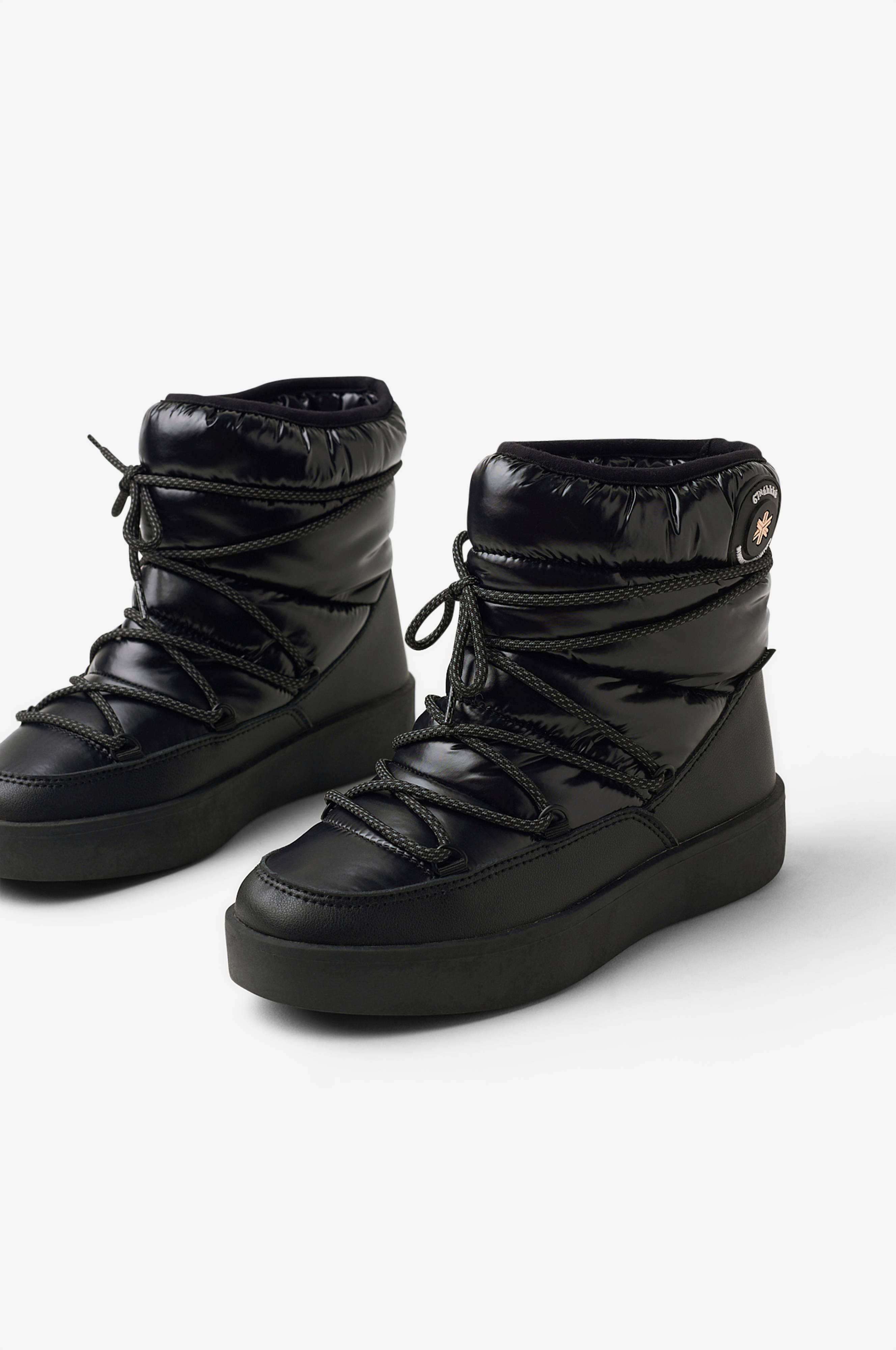 Lämminvuoriset talvikengät, joiden vedenpitävä áphiTec4.0-kalvo hengittää ja siirtää kosteutta pois. Päällinen kangasta ja nahkajäljitelmää. Topattu varsi. Pehmeä tekoturkisvuori. Ulkopohja kumia. Varren korkeus n. 14 cm koossa 37. Pohjan korkeus n. 3,5 cm.