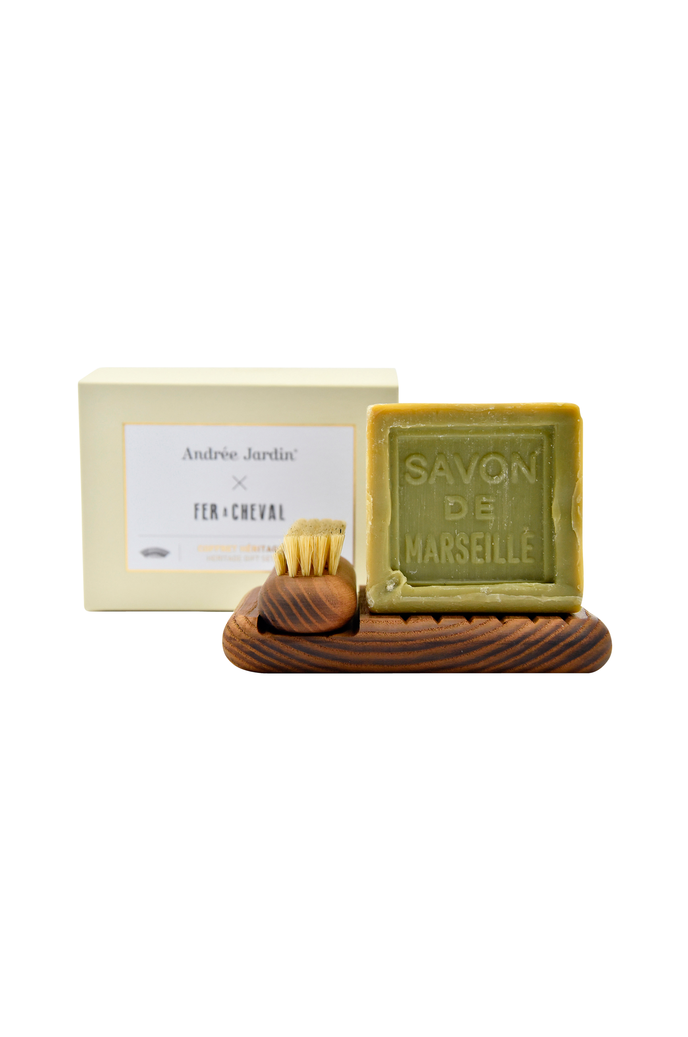 Lahjasetti, jossa perinteinen Savon de Marseille -saippua sekä saippua-alusta ja kynsiharja kaunista saarnipuuta, joka on lämpökäsitelty kosteuden- ja vedenkestäväksi.