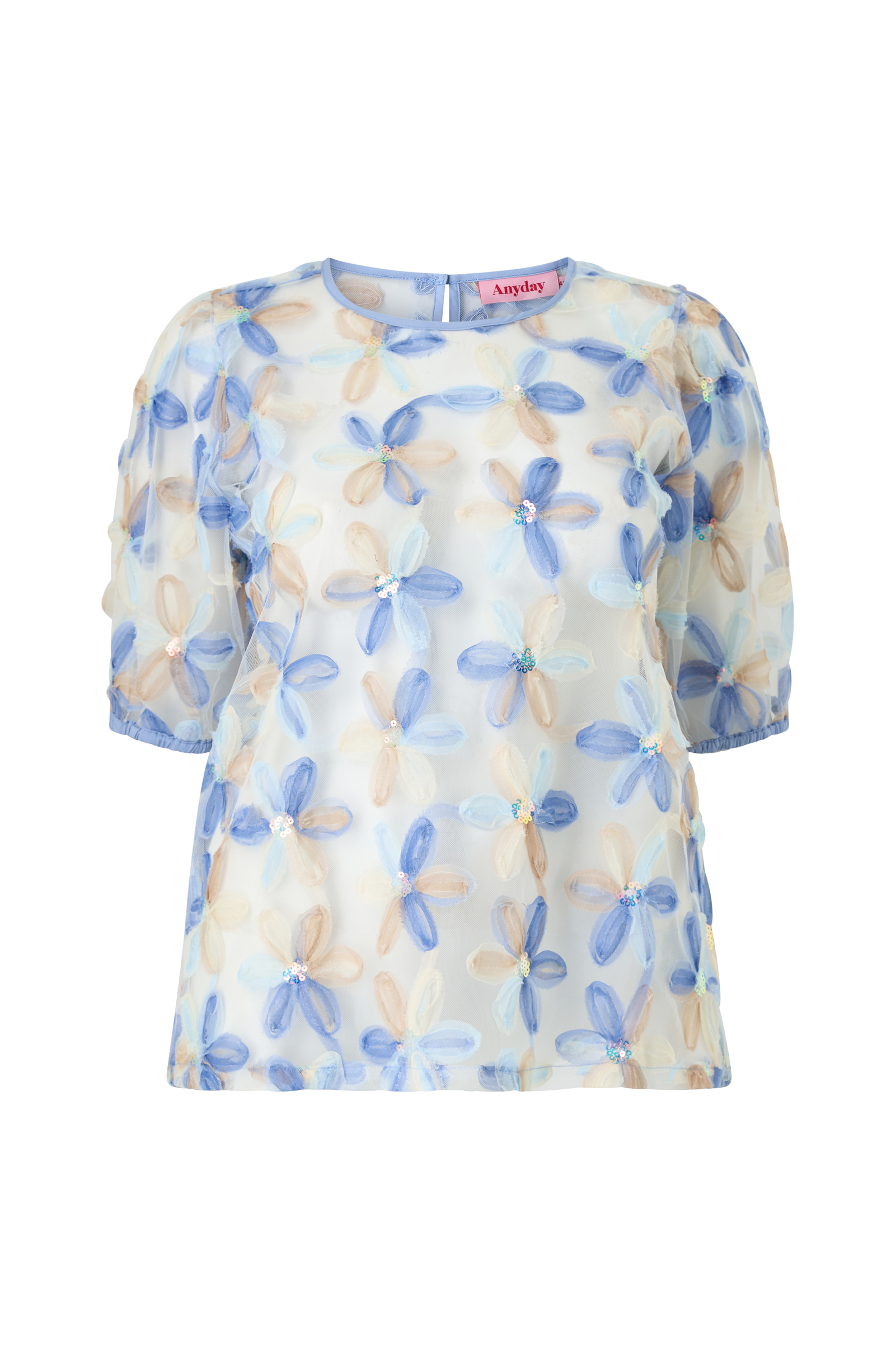 • Läpinäkyvä pusero verkkokankaasta kukka-applikaatioilla ja paljeteilla kauttaaltaan