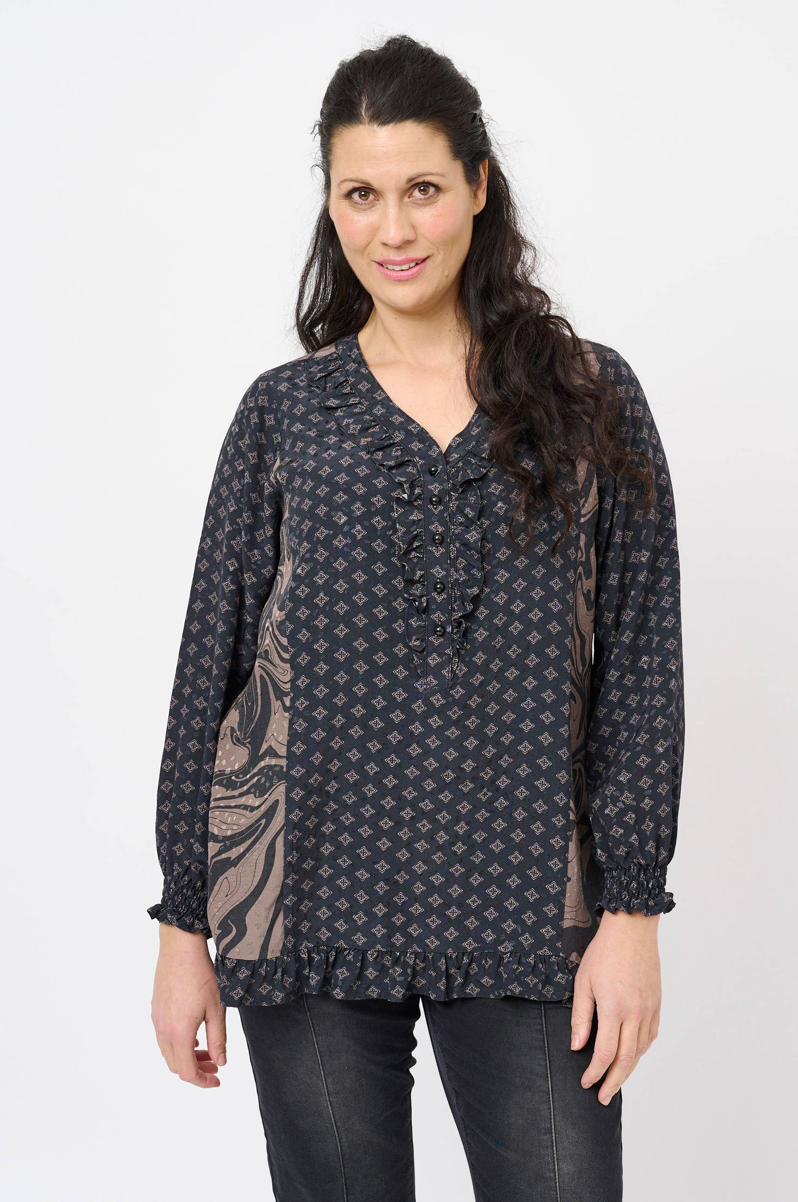 • Plus-koot• Rento malli• V-kaula-aukko röyhelöreunalla ja lyhyellä nappietupuolella• Pitkä hiha kuminauhalla hihansuissa