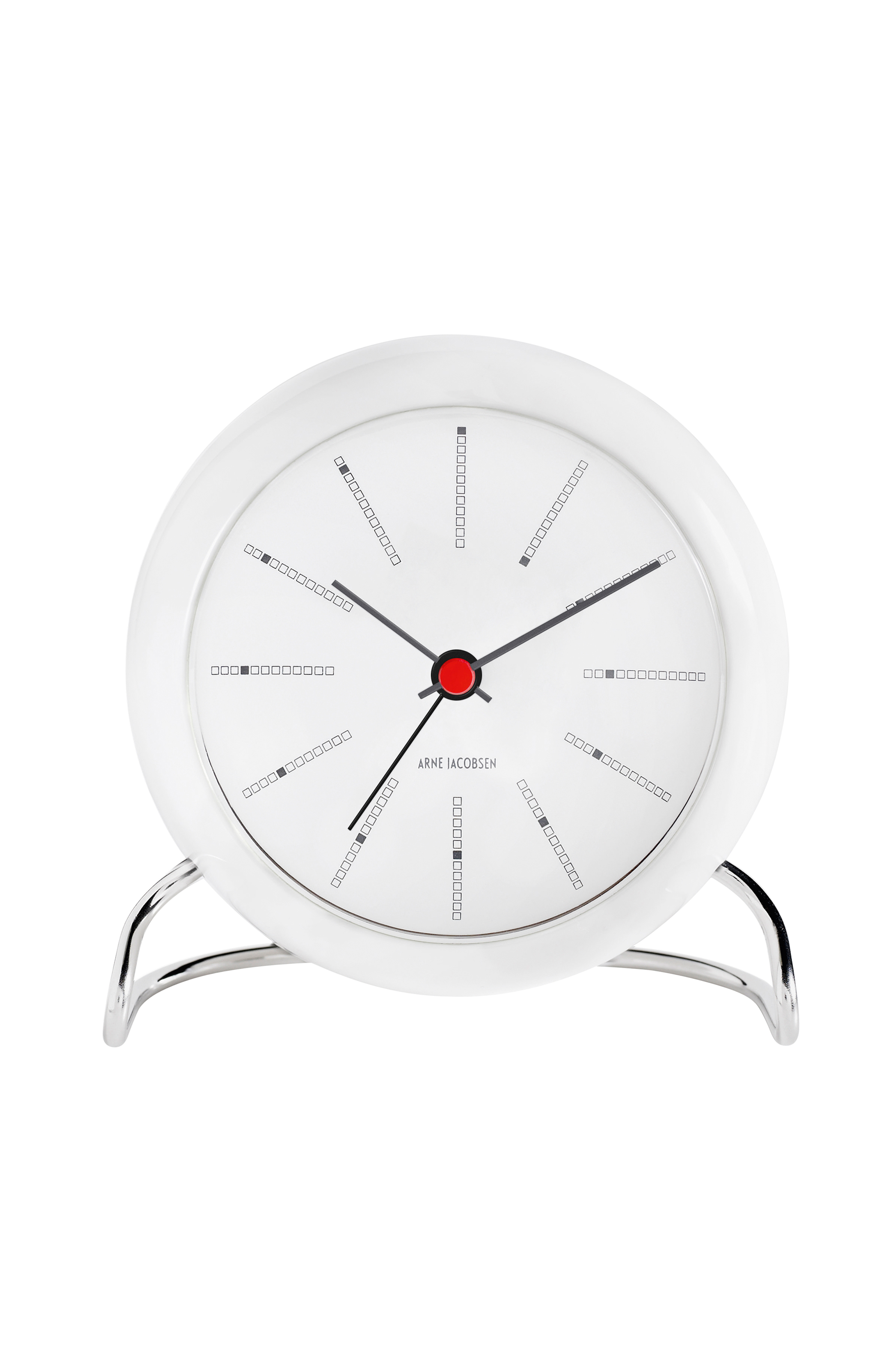 Arne Jacobsenin kaunis Bankers-pöytäkello on valmistettu karkaistusta iskunkestävästä lasista. Bankers-pöytäkellon halkaisija on 11 cm. Mustat yksityiskohdat antavat kellolle ainutlaatuisen ilmeen. Massiivinen jalka ruostumatonta terästä.
