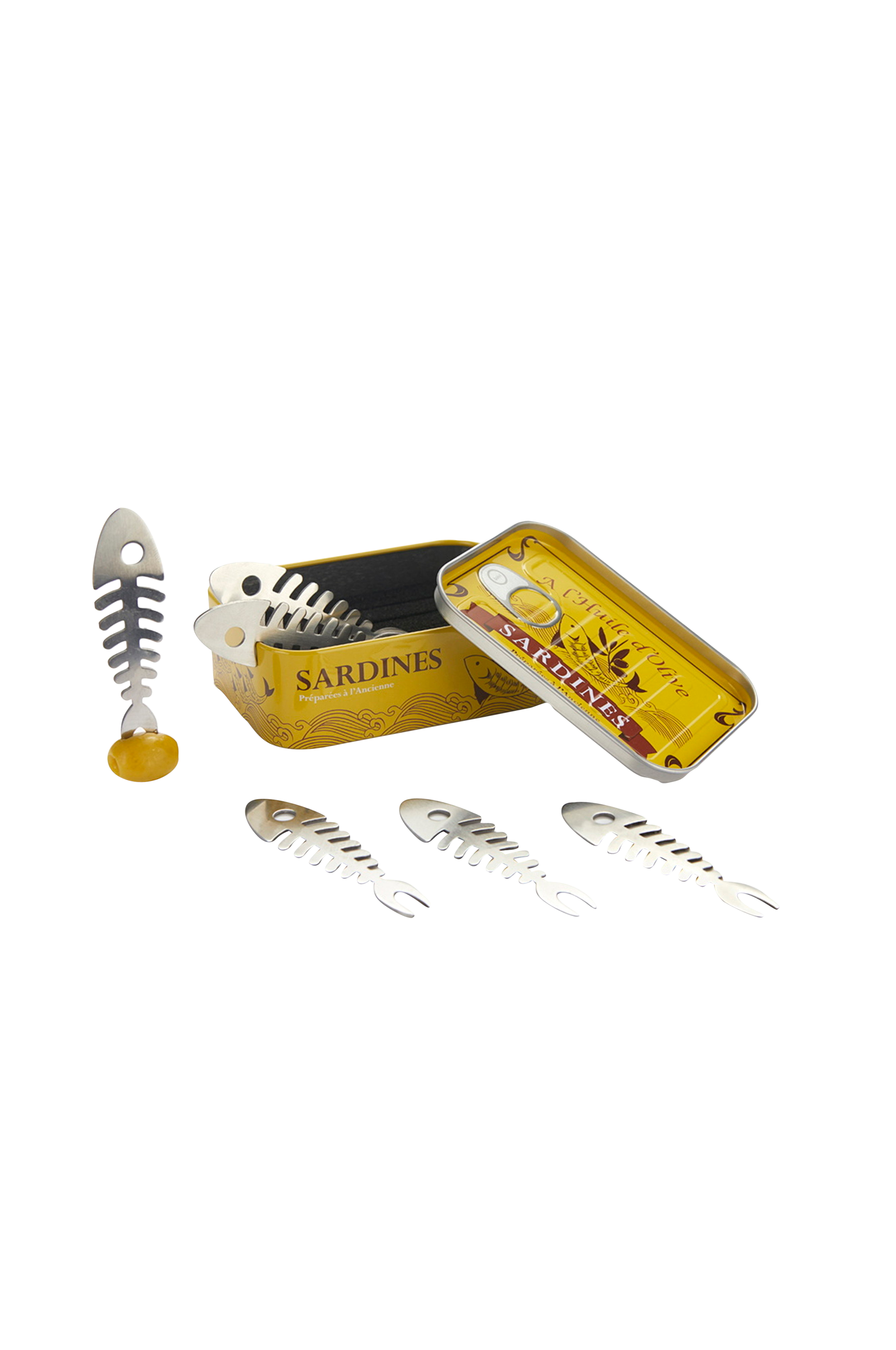 Sardines 6 kalaluun muotoisen välipalahaarukan setti, joka on esitetty vintage-muotoilussa sardines -purkissa. Välipalahaarukat on valmistettu ruostumattomasta teräksestä. Alkuperäinen. Omaperäinen tapa koristella pöytää välipalatunnin aikana. Perheesi ja ystäväsi tulevat pitämään siitä. Laatua. Valmistettu ruostumattomasta teräksestä lujuuden ja kestävyyden vuoksi. Astianpesukoneen kestävä. Välipalahaarukat ovat astianpesukoneen kestäviä. Sisältö: Pakkaus sisältää mm. Koristeltu pelti ja 6 kalanluun muotoista pidikettä, 2. 2 x 8 cm, ruostumatonta terästä. Mitat: 3,5x10,5x7,8 cm Materiaali: tina/ruostumaton.