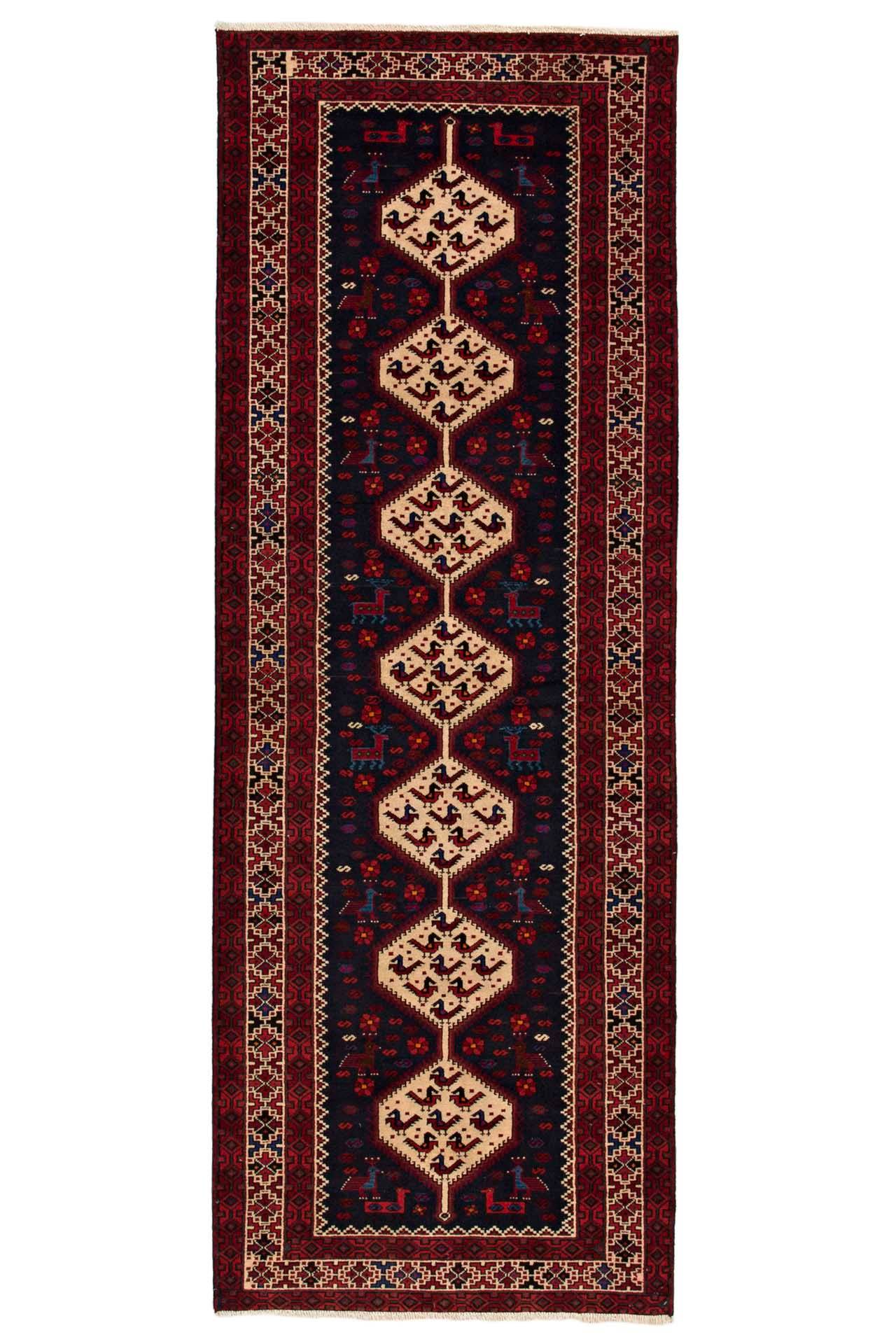 Länsi-Iranista peräisin oleva nomadimatto, jonka geometrisia kuvioita hallitsevat tummanpunainen ja tummansininen väri.