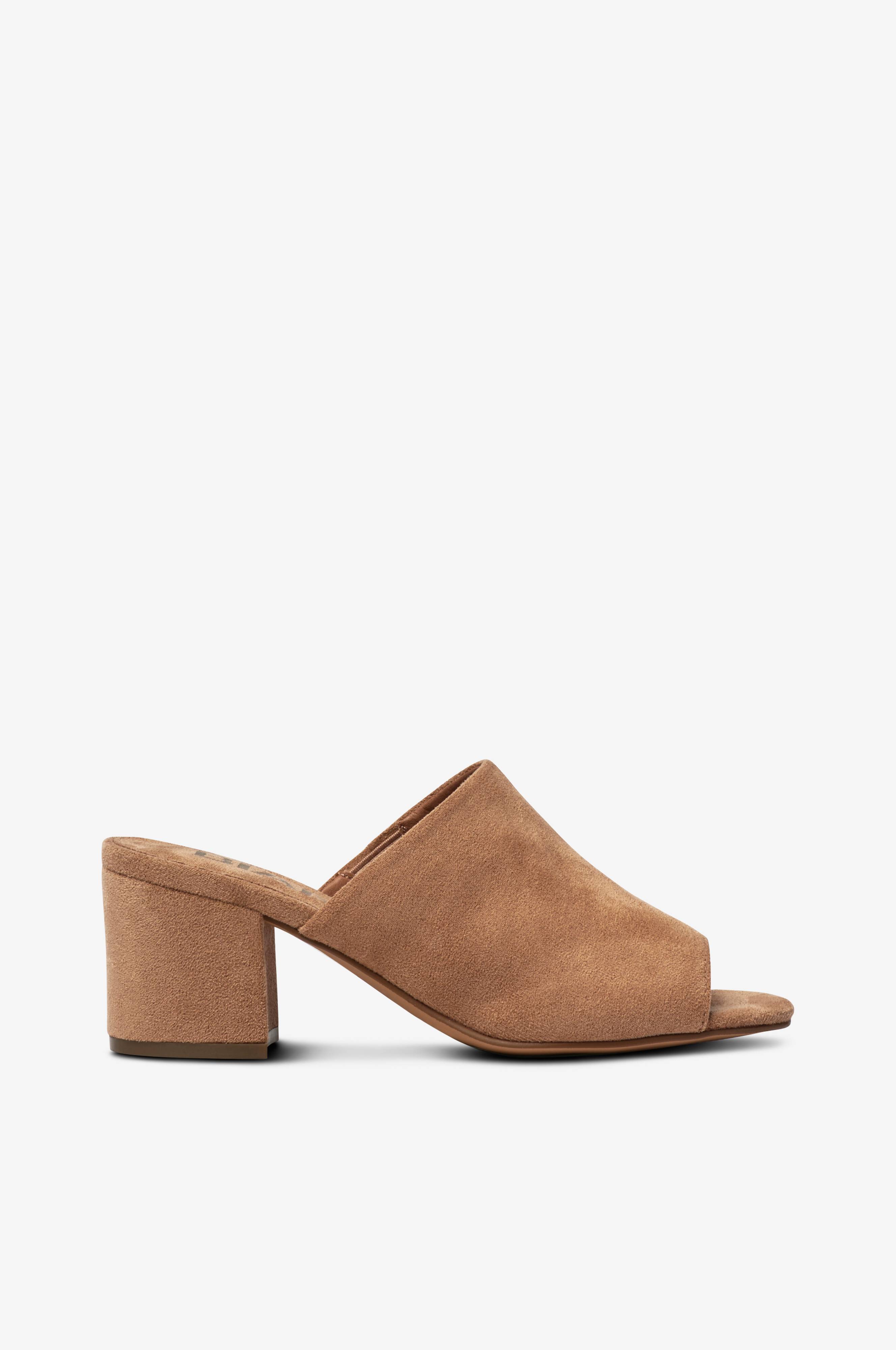 Sandaletit, joissa sametinpehmeä kangaspäällinen, nahkapäällysteinen sisäpinta ja pieni venyke sivulla. Päällystetty tolppakorko. Koron korkeus n. 6 cm.