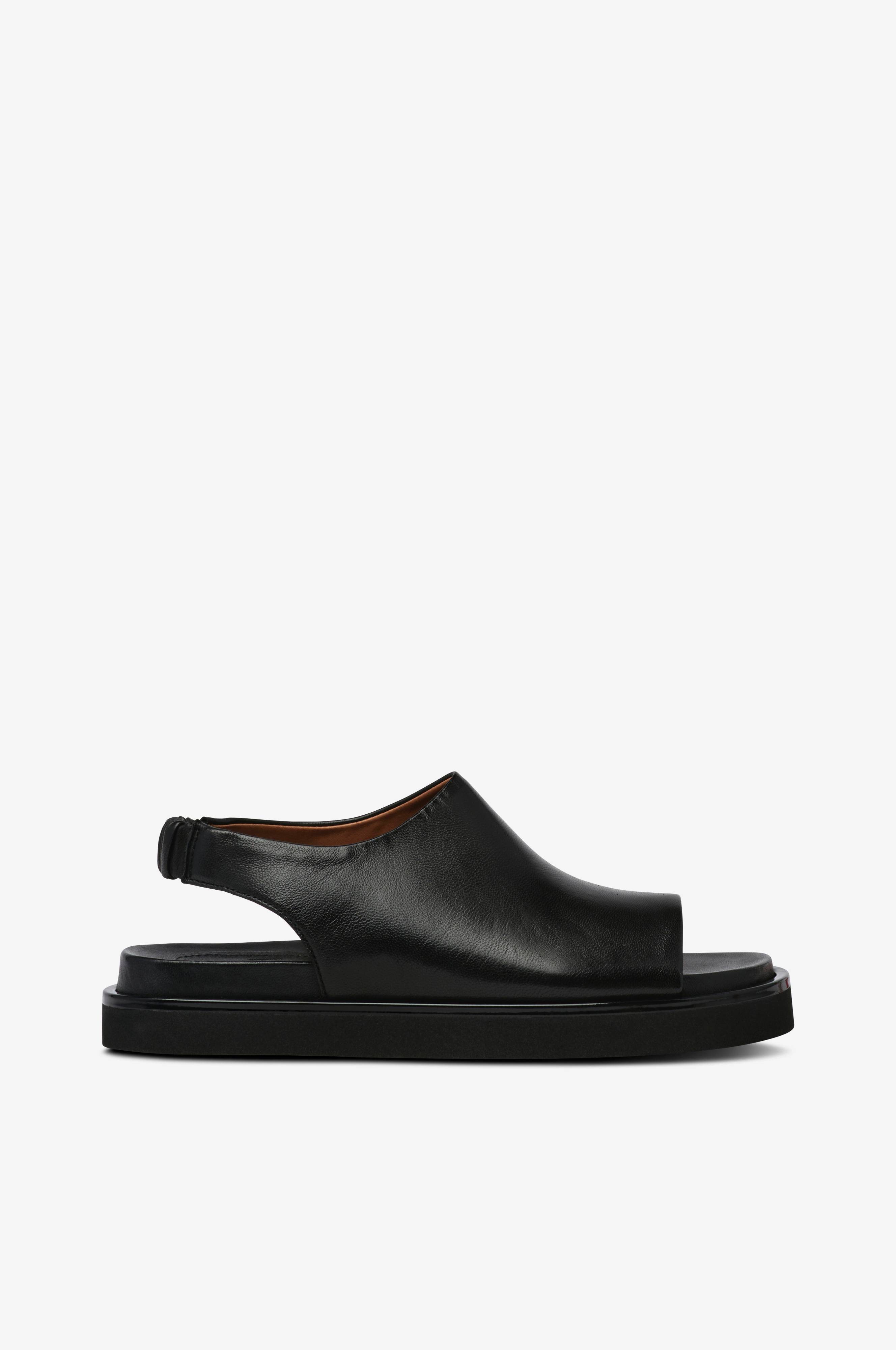 Sandaalit pehmeää, sileää nahkaa. Avoin kärki. Kannassa joustava remmi. Vuori ja sisäpohja nahkaa.