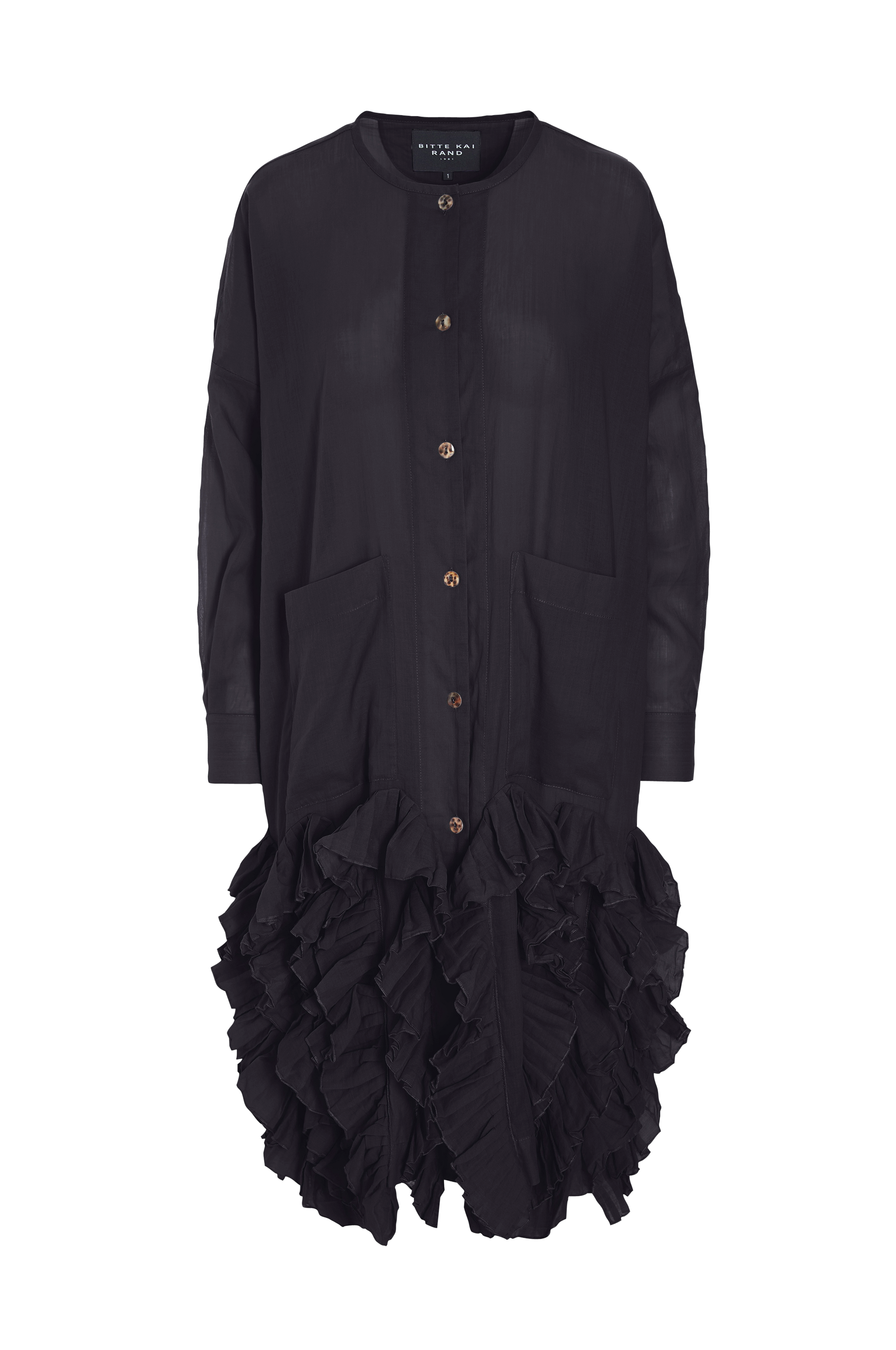 - Pyöreä pääntie- Pitkät hihat, joissa kalvosimet- Päälleommellut taskut- Röyhelödetaljit- Täyspitkä kiinnitys, jossa helmiäishohtoiset napit- Pituus n. 115 cm koossa 34/38