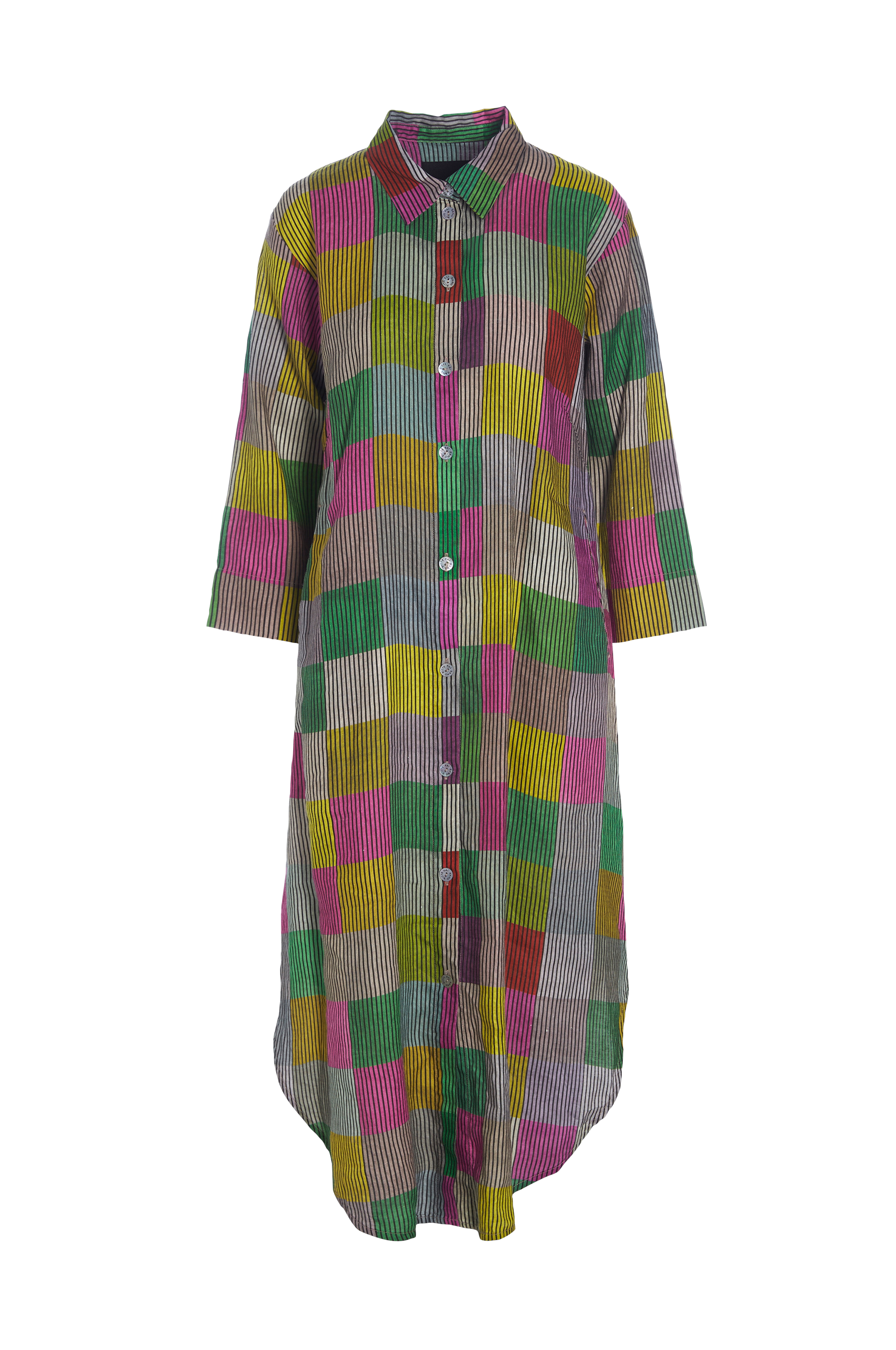- Pellavamekko- Monivärinen ruudullinen kuvio ja raidallinen tausta- Paidankaulus- Kokopitkä napitus helmiäismaisilla napeilla- Taskut- Hieman lyhyehköt hihat- Helmassa pyöristetty muoto ja sivuhalkiotPituus n. 127 cm koossa XL