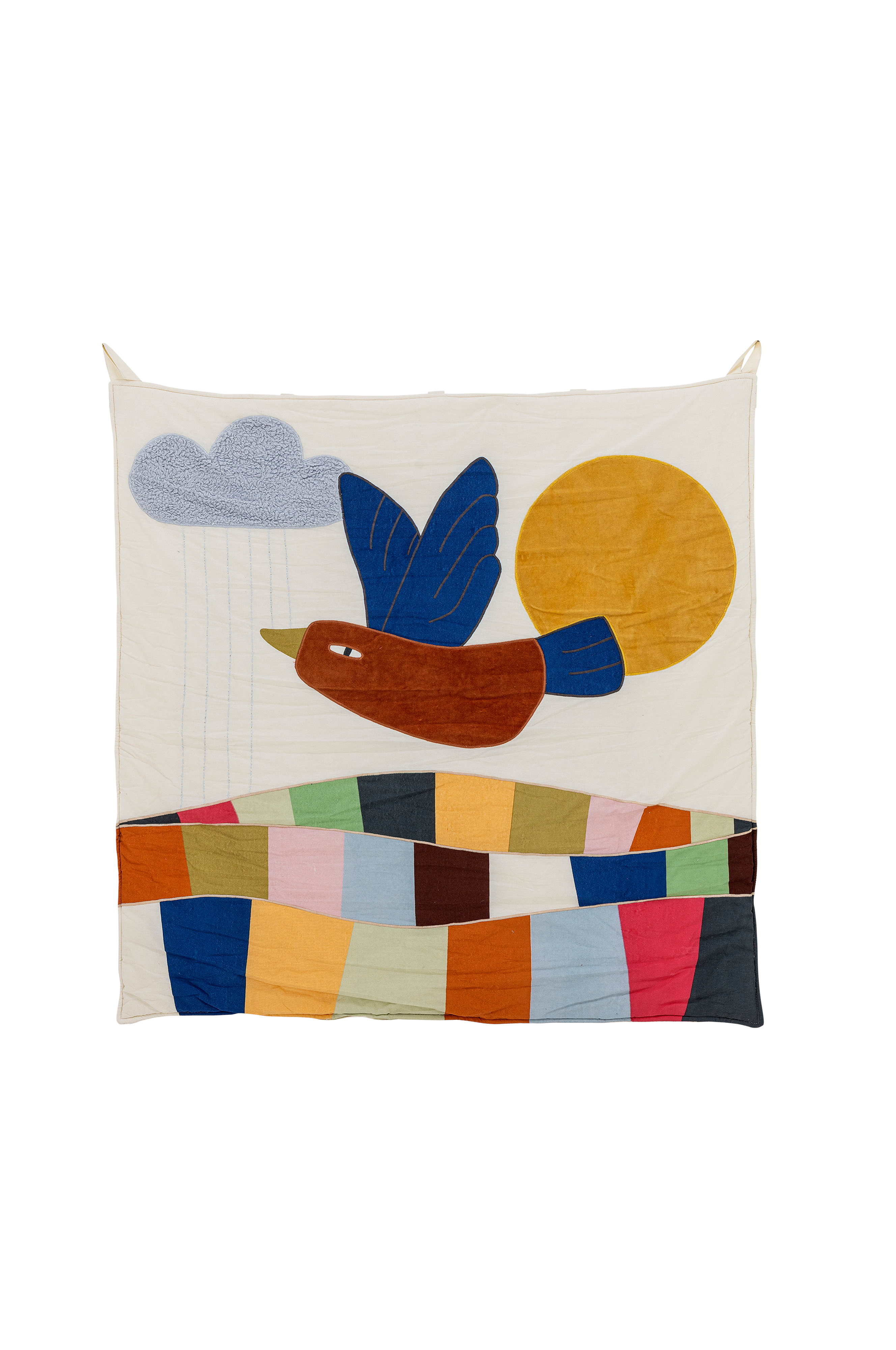 Bloomingville minin colorine-seinäkoriste on valmistettu puuvillasta, ja siinä on seesteinen motiivi linnusta, joka lentää rauhallisen maiseman yllä. Kaunis seinäesine tuo lämpöä ja persoonallisuutta lastenhuoneeseen.