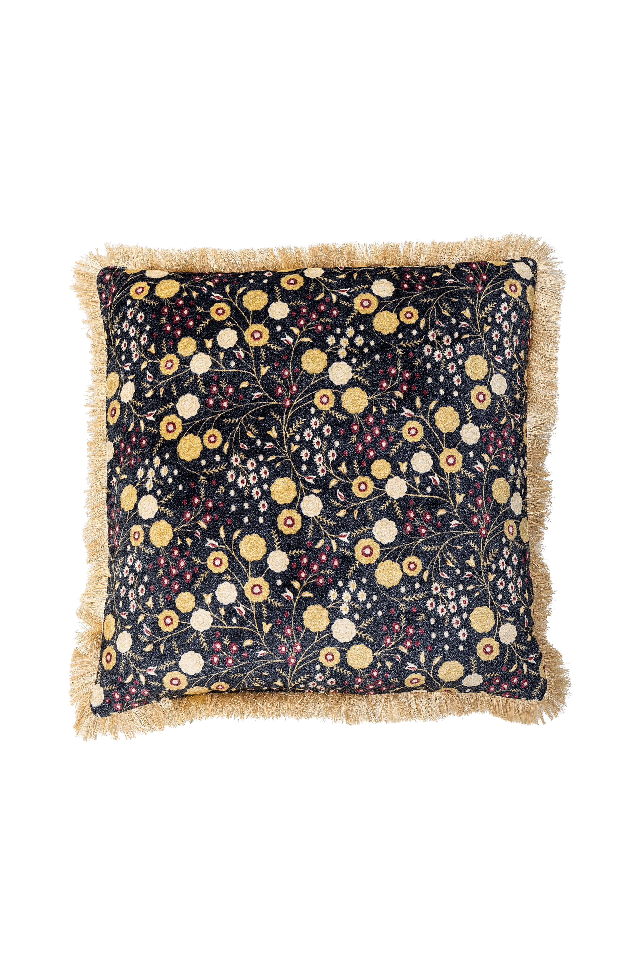 Bloomingvillen Eydis-tyyny on valmistettu pehmeästä puuvillaveluurista, jossa on painettu kuvio. Tyynyn ympärillä on kapeat hapsut, jotka korostavat koristeellista ilmettä.