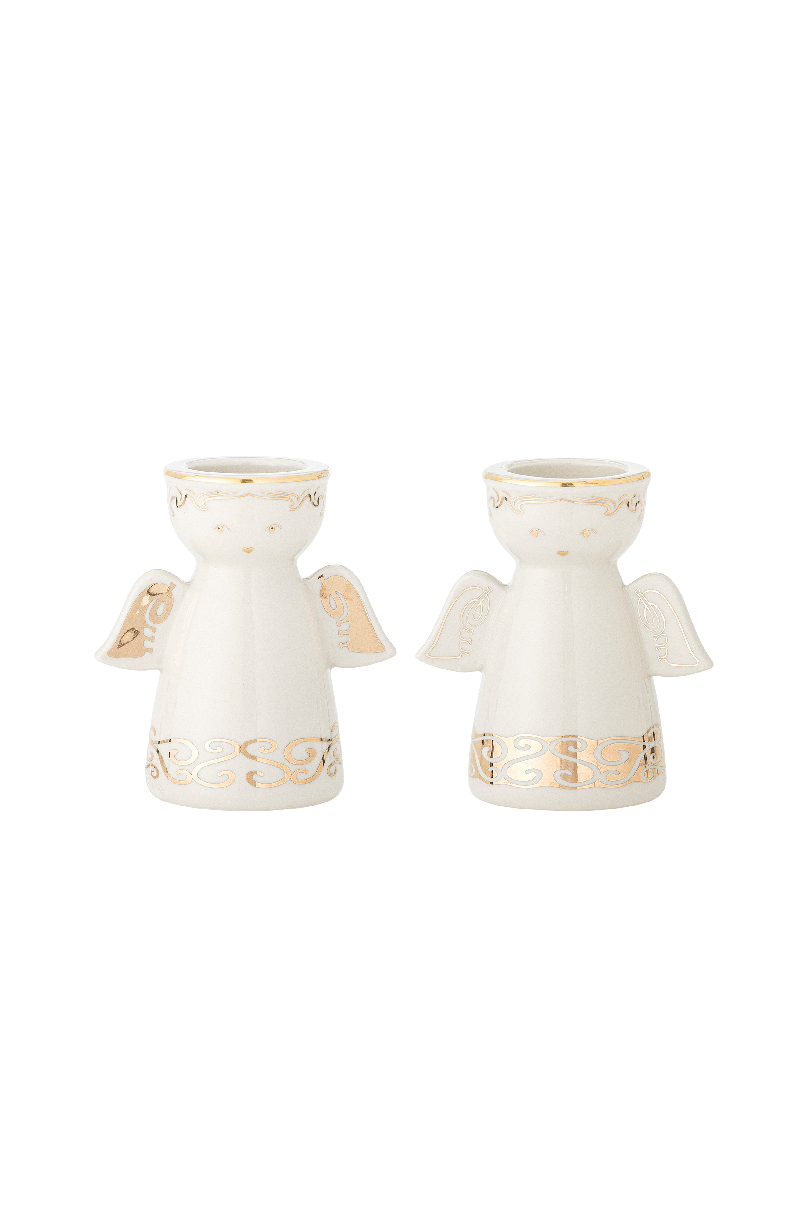 Bloomingvillen Faella Votive & Candle Holder on kahden tyylikkään enkelin muotoisen kynttilänpidikkeen sarja. Ne on valmistettu valkoisesta kivitavarasta ja koristeltu hienoilla kultaisilla yksityiskohdilla sädekehässä ja mekon kauniilla kuviolla, ja ne sopivat täydellisesti lämpimän ja juhlallisen tunnelman luomiseen joulupöytään tai osaksi kodin sisustusta.