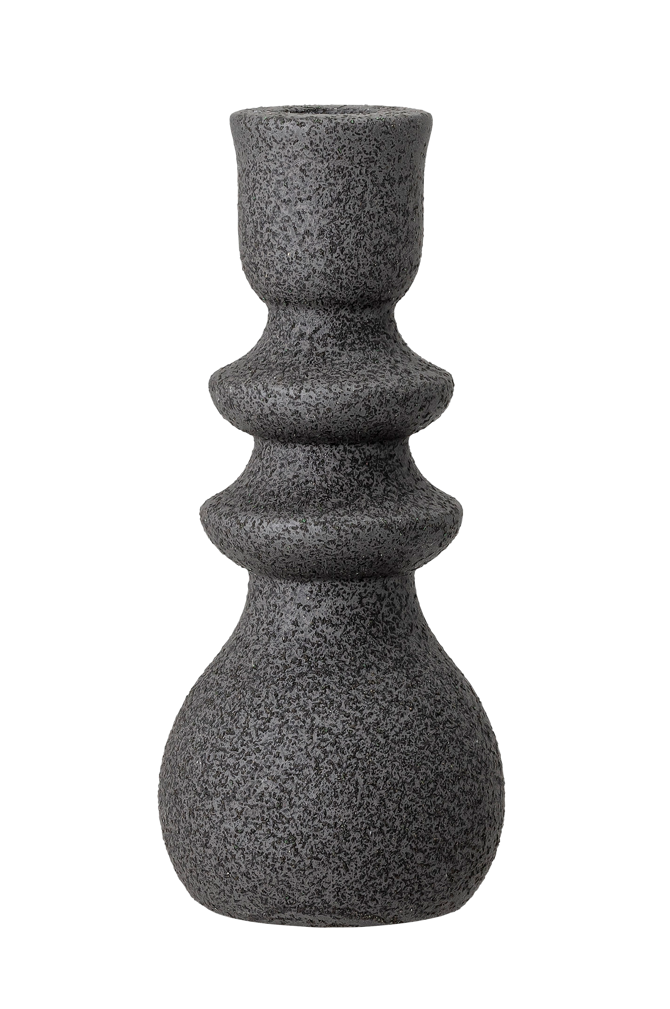 Kaunis kynttilänjalka kivitavaraa, jossa musta reaktiivinen lasitus. Sopii osaksi ryhmää tai yksinään. Mitat 8x19 cm.