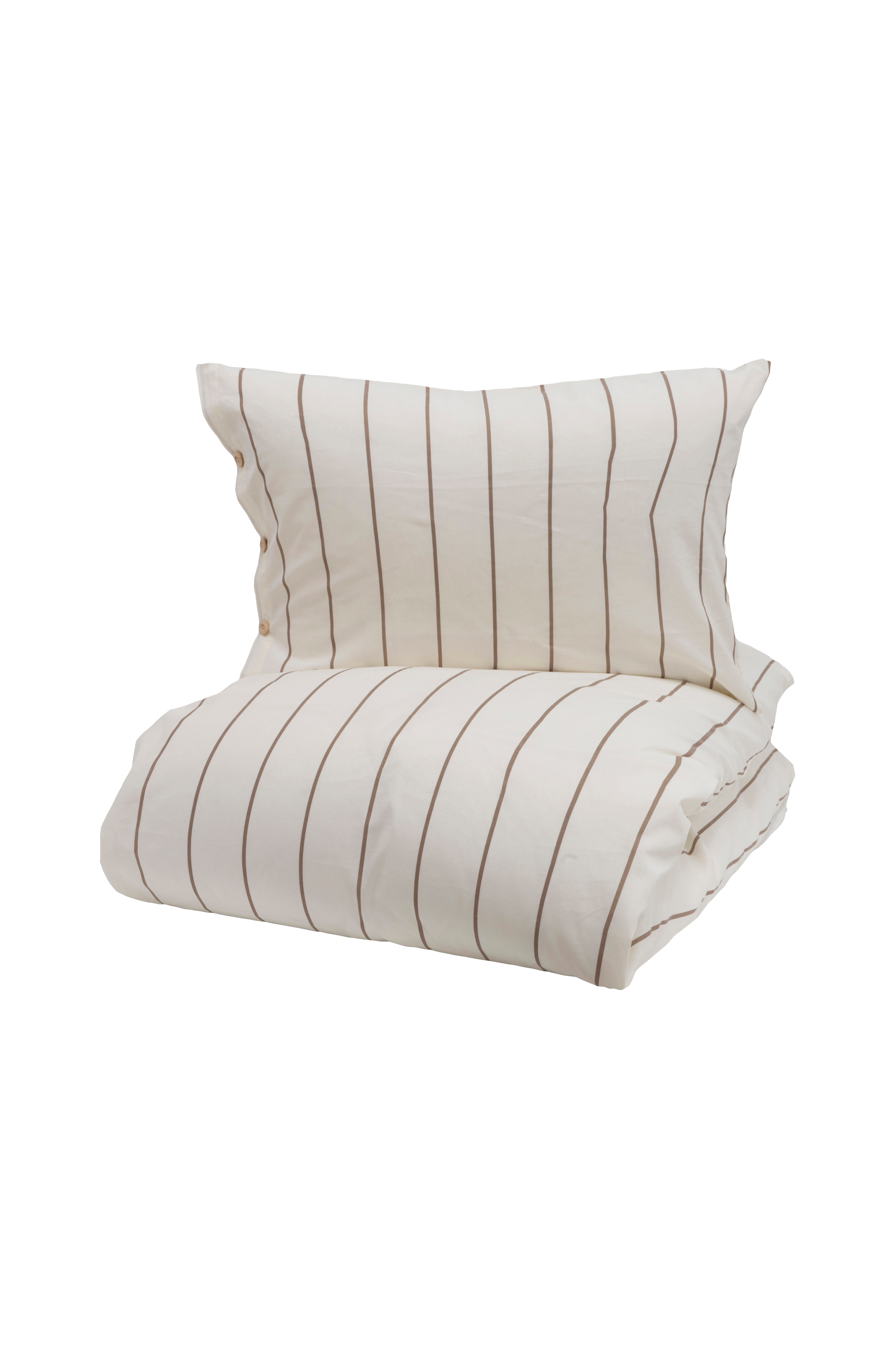 100-prosenttisesta puuvillasta valmistetussa Royan-vuodevaatesarjassa on vaalean beige perusväri, jossa on kapeita ruskeita raitoja ja käytännölliset nappikiinnikkeet. Minimalistinen värimaailma ja hienovaraiset raidat luovat rauhallisen ja harmonisen ilmapiirin, joka sopii täydellisesti niille, jotka arvostavat makuuhuoneessaan yksinkertaisuutta ja lämpöä. Vuodevaatesetti on valmistettu 100-prosenttisesta puuvillasta ja se on oeko-tex made in green -sertifioitu. Pussilakanoissa on alareunassa puunapeilla varustettu aukko ja tyynyliinoissa on sivussa aukko ja puunapit. Vuodevaatesetin koko 150x210, sisältää 1 pussilakanan ja 1 tyynyliinan, 50x60 cm. Vuodevaatesetin koko 230x220, sisältää 1 pussilakanan ja 2 tyynyliinaa, 50x60 cm.