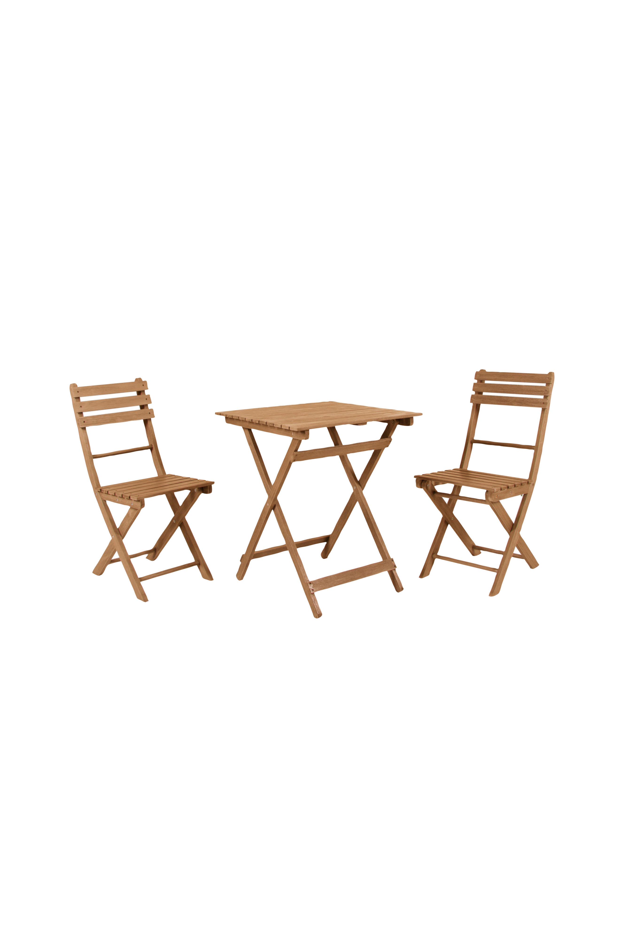 Klassinen kokoontaitettava kahvilasetti (2 tuolia ja 1 pöytä) akaasiaa. Pöytä: Ø 60 cm, korkeus 73 cm, Tuoli: leveys 38, syvyys 54, korkeus 86 cm.