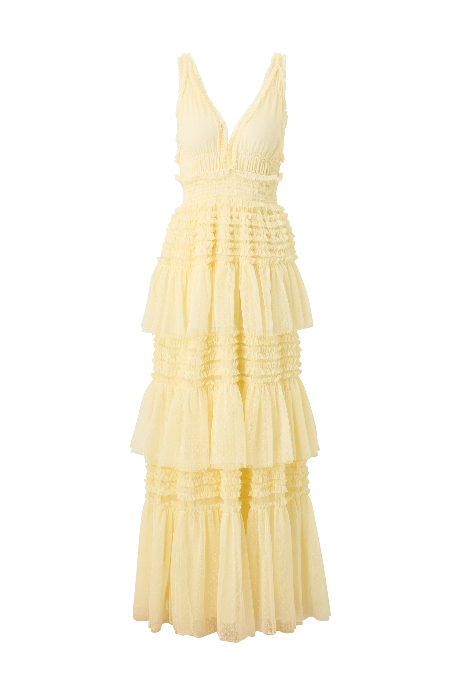 • Pitkä, hihaton röyhelömekko tyllistä• Syvä v-kaula-aukko edessä ja takaosa• Rypytys vyötäröllä• Pituus: 150 cm koossa 36