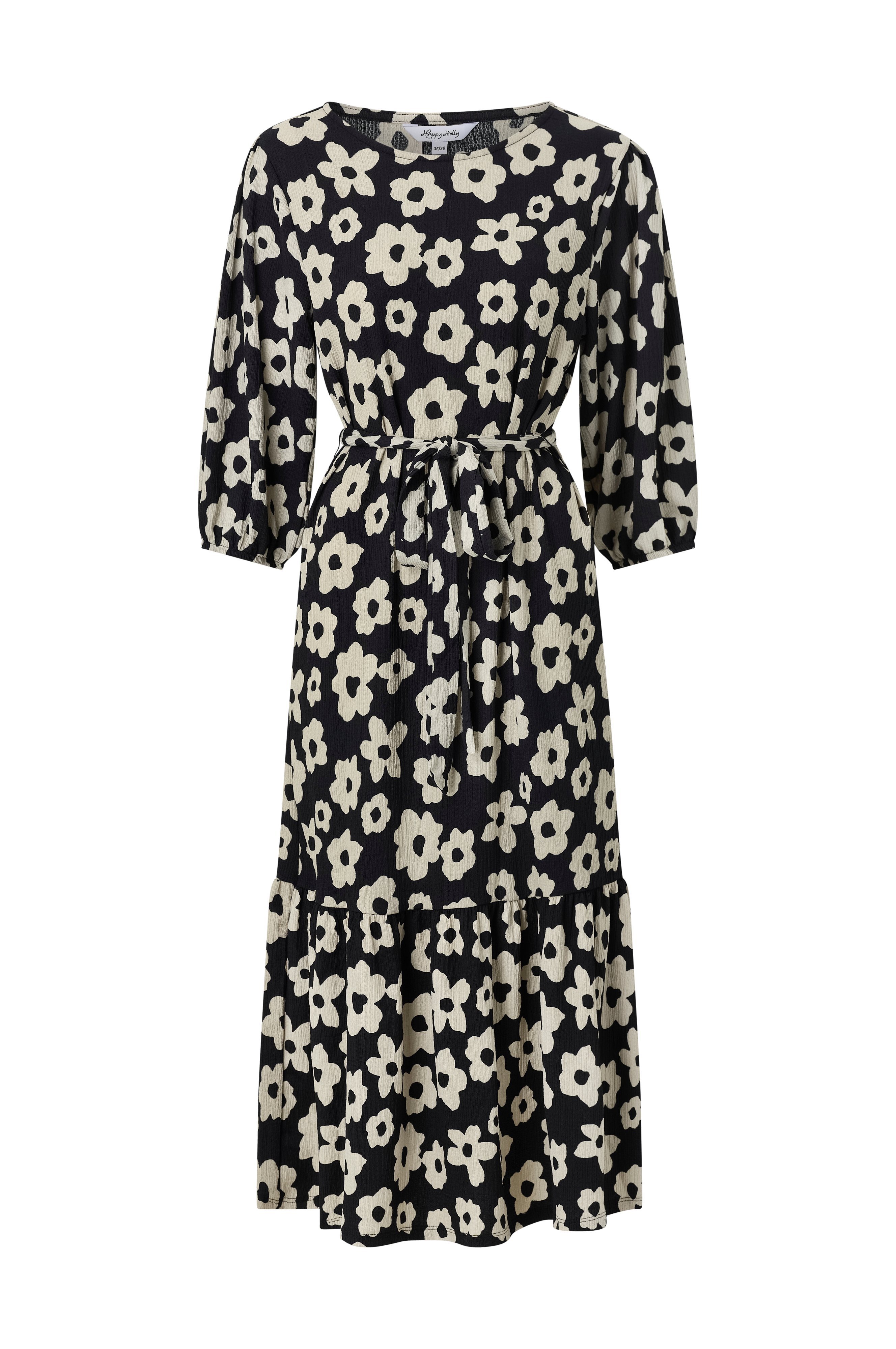 • Pinnoitettu mekko• Pyöreä kaula-aukko• Puolipitkät puhvihihat• Kuminauha hihansuissa• Nyöri vyötäröllä• Leveä röyhelö alhaalla• Pituus: 126 cm koossa 36/38