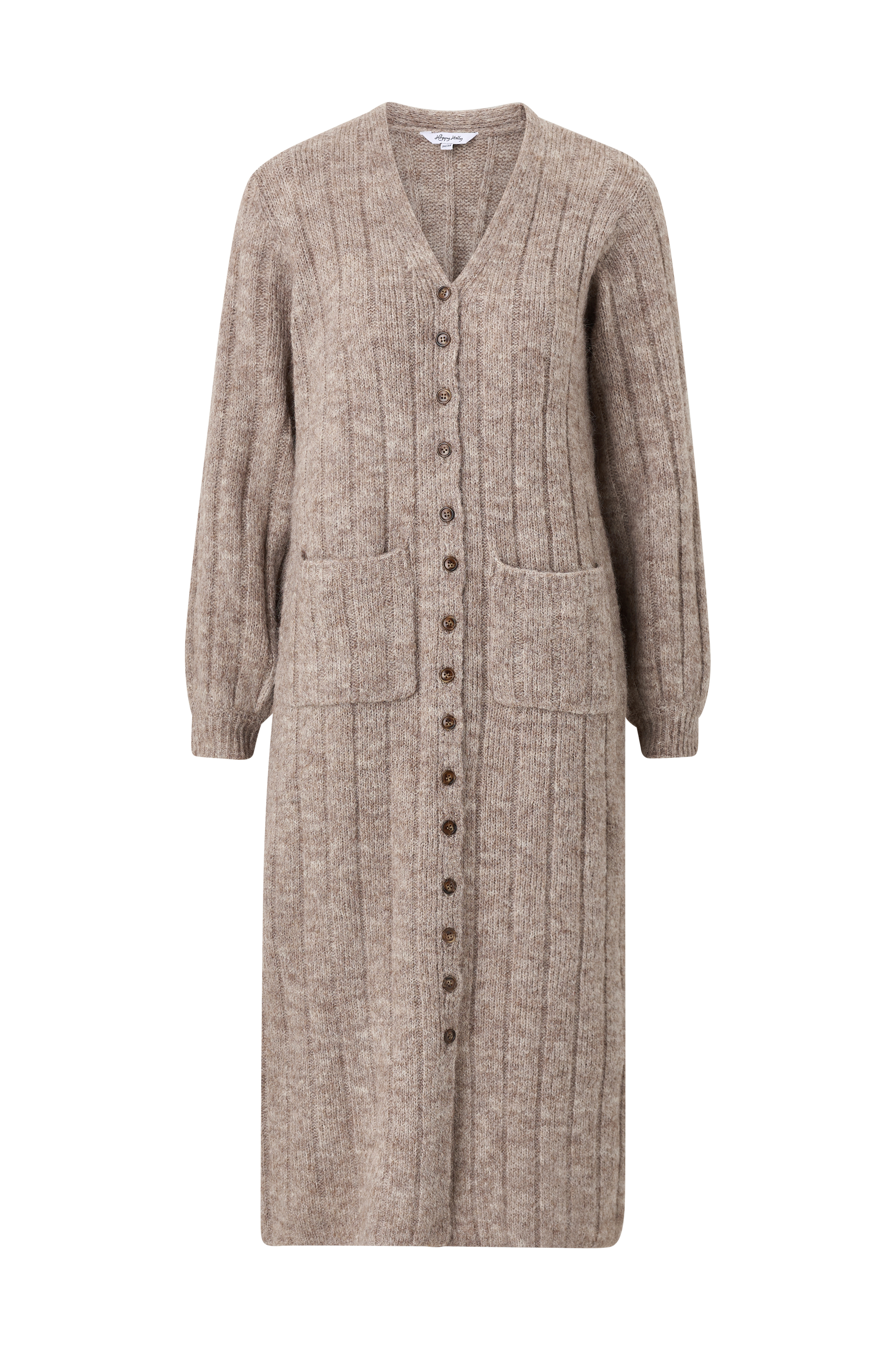 • Pitkä, resorimainen neuletakki v-muotoisella pääntiellä• Napit suoraan eteenpäin• Pitkät hihat ribbiresoreilla hihansuissa• Etutaskut• Voidaan käyttää sekä villatakkina että mekkona.• Pituus: 119 cm koossa 36/38