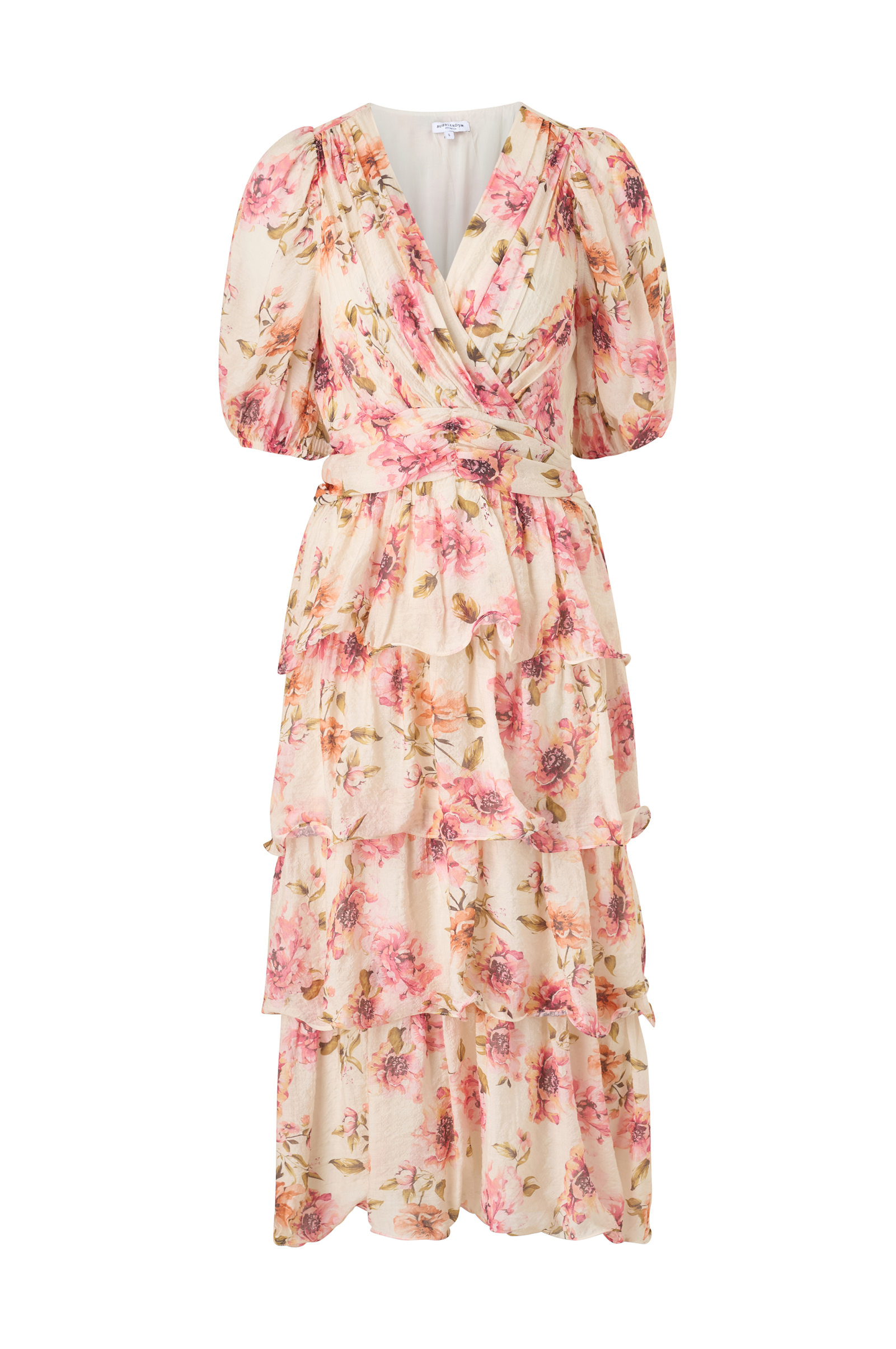 • V-kaula-aukko kietaisukappaleella• Lyhyet bubble-hihat• Poimutettu vyötärö rypytyksellä takaosa• Röyhelöhame• Pituus: 125 cm koossa S