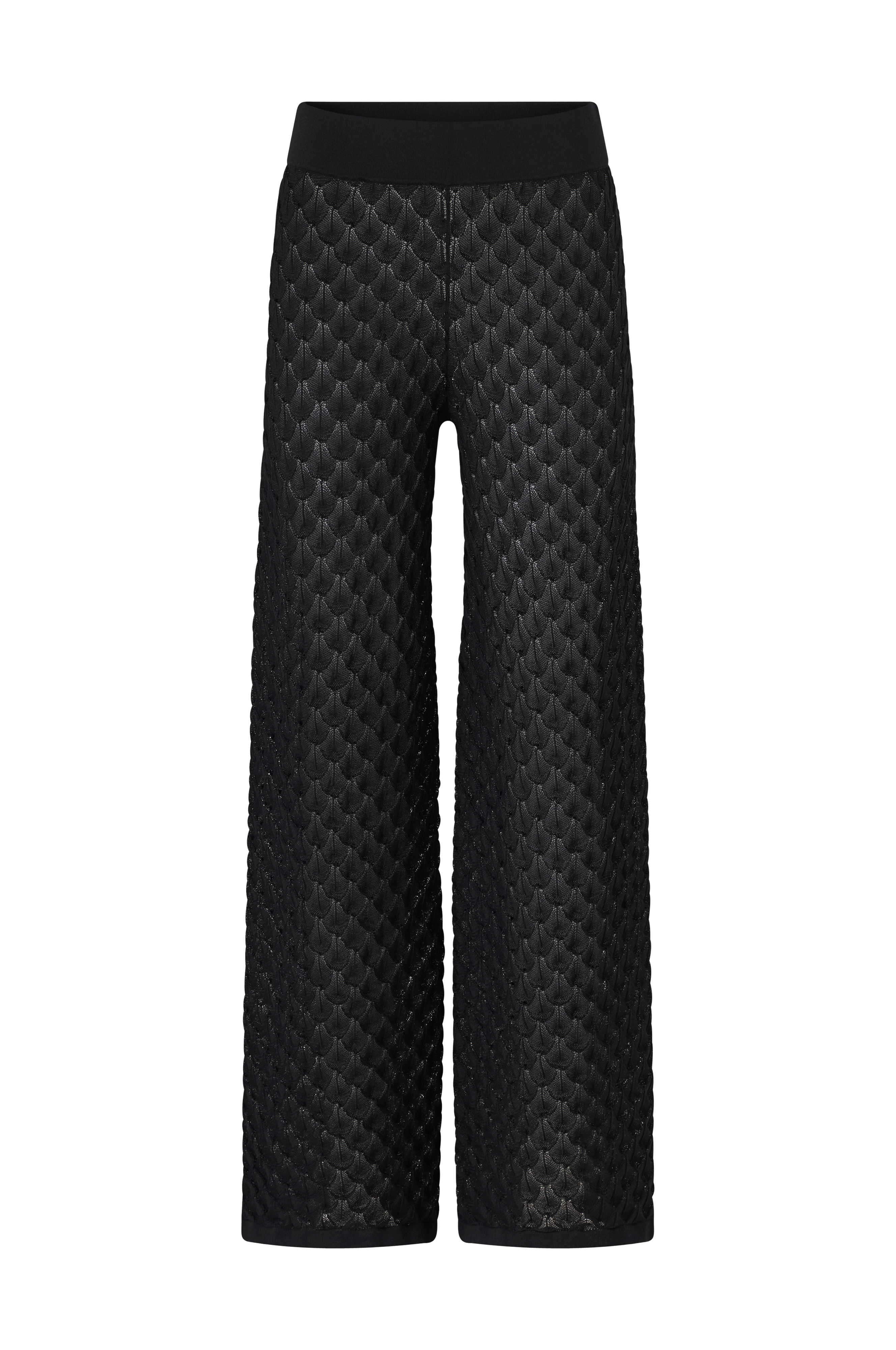 • Kuvioneulottu malli leveillä, suorilla jaloilla