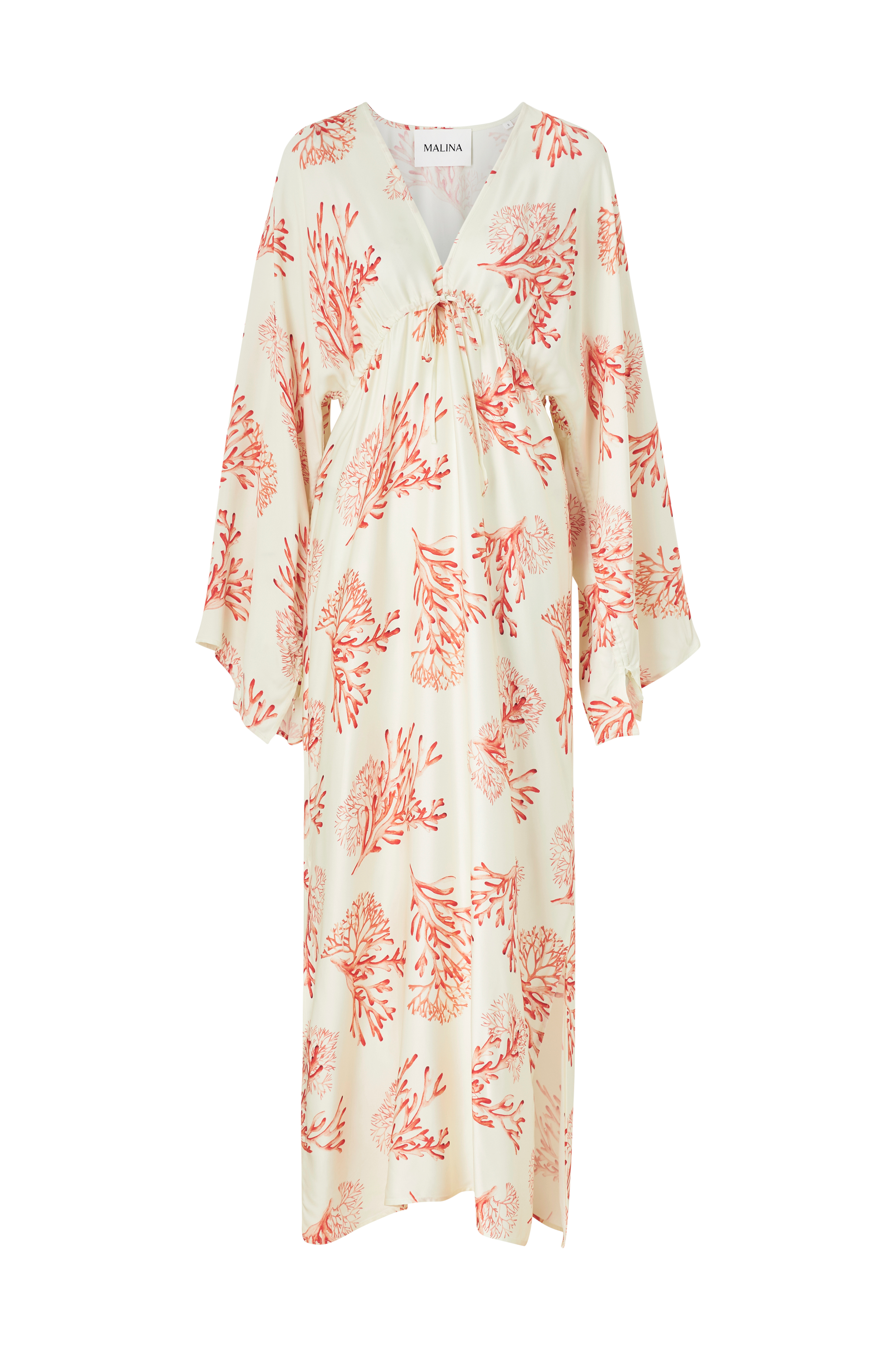 • Tyköistuva malli• V-muotoinen pääntie• Kiristysnyöri nyörillä• Hyvin leveä kimonotyylinen hiha drapeerauksella ja solmittavalla vyöllä alla• Korkeat halkiot alhaalla sivuilla• Pituus: 140 cm koossa S