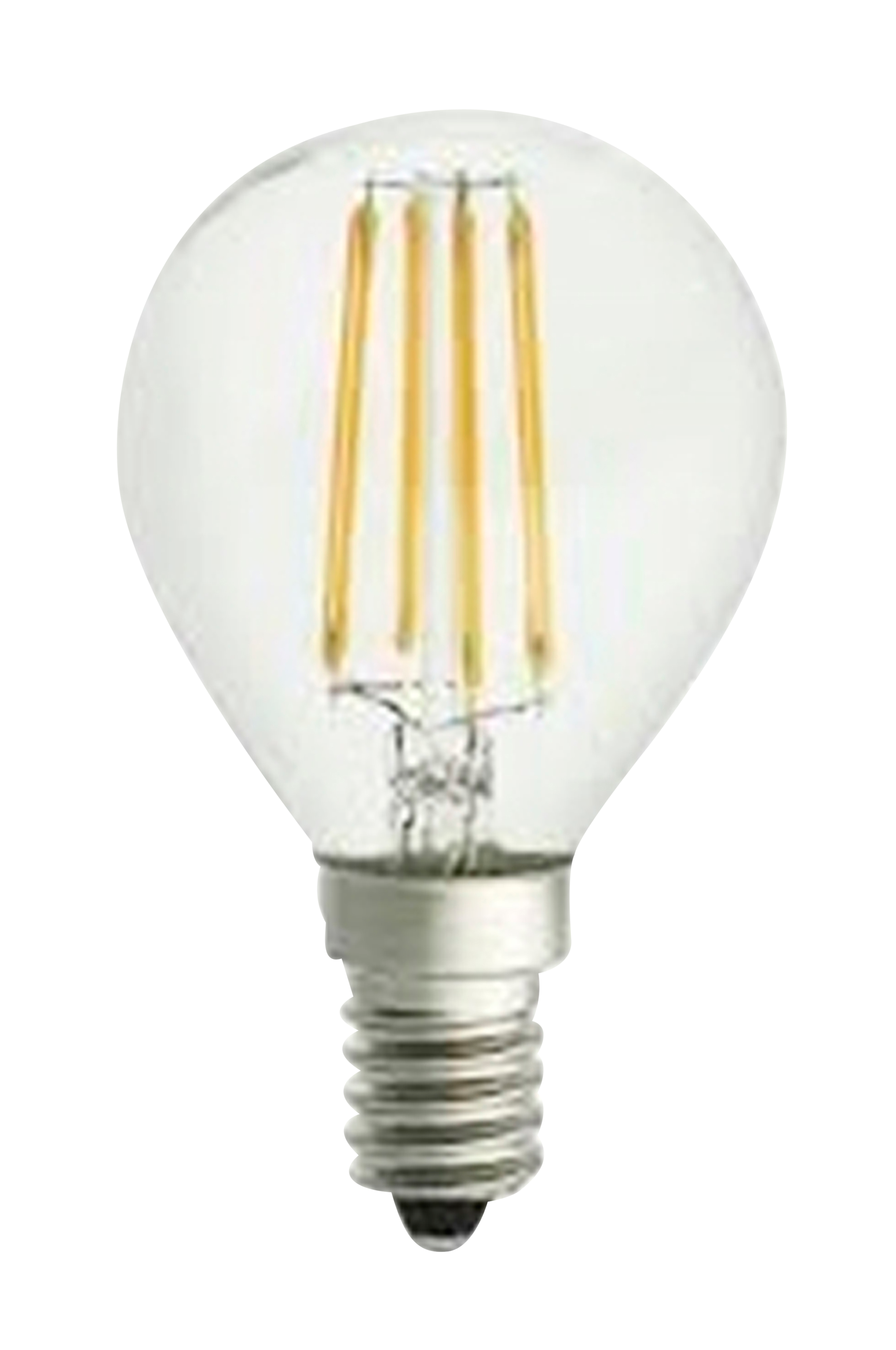 Filament koristelamppu, LED himmennettävä pallolamppu. Lampunkanta E14. Enintään 4 W. 2700 K. 360 lm. Korkeus 7 cm ja halkaisija 4,5 cm.