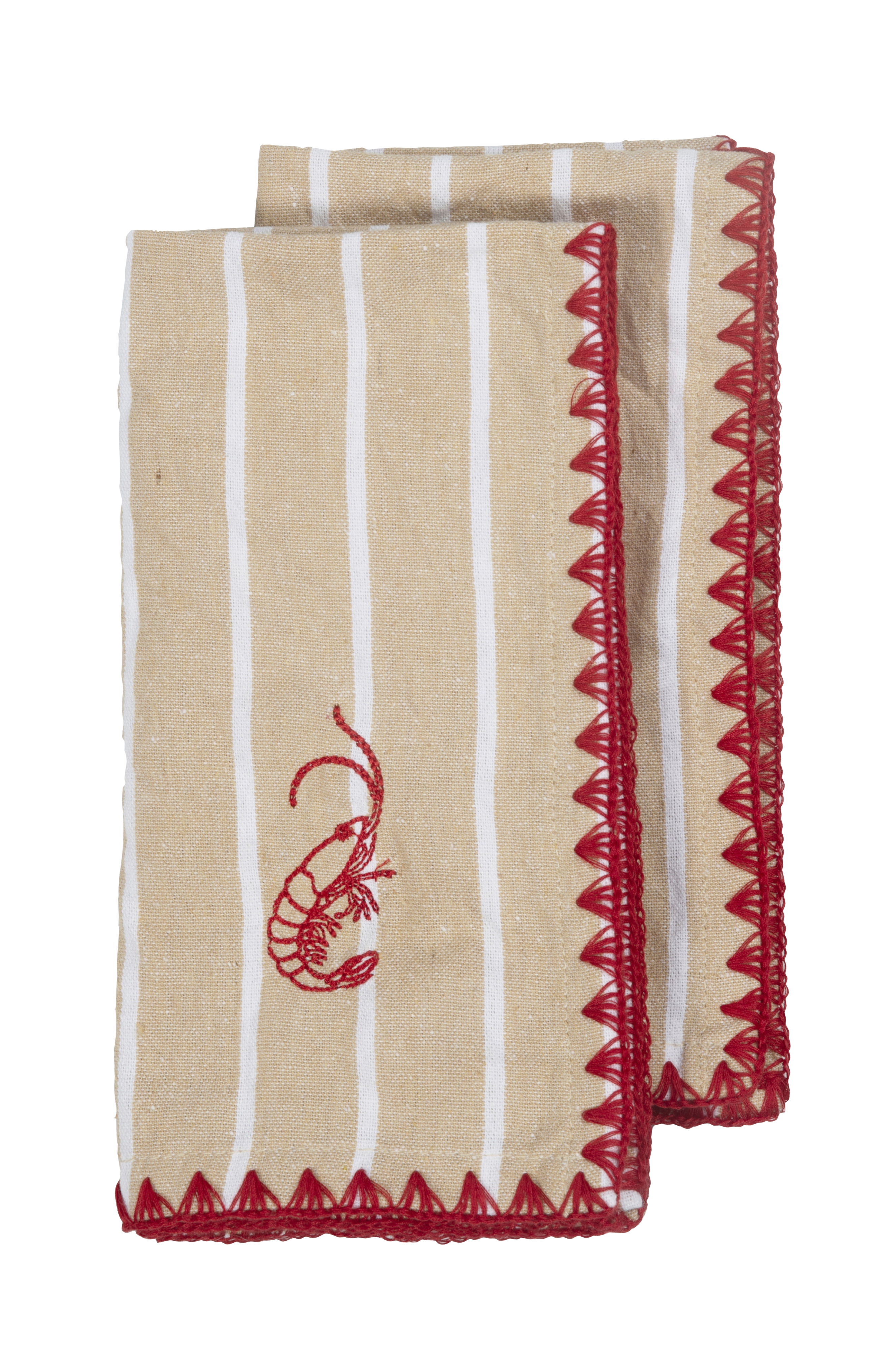 Bubba -keittiöpyyhkeessä on ajattomia beigejä ja valkoisia raitoja, joita täydentää ommeltu reuna, jossa on punainen kontrasti, joka lisää tyylikkyyttä. Leikkisä kirjailtu katkarapu lisää viehätystä keittiörutiineihisi. Yhdistä samaan sarjaan kuuluvien pöytäliinan ja lautasliinojen kanssa koordinoidun ilmeen luomiseksi. Valmistettu 70 % kierrätetystä puuvillasta ja 30 % kierrätetystä polyesteristä. Mitat: 50x70 cm. Toimitetaan kaksiosaisena pakettina, joka on sidottu nauhalla ja rusetilla. Suunnittelija: Byon Studio.
