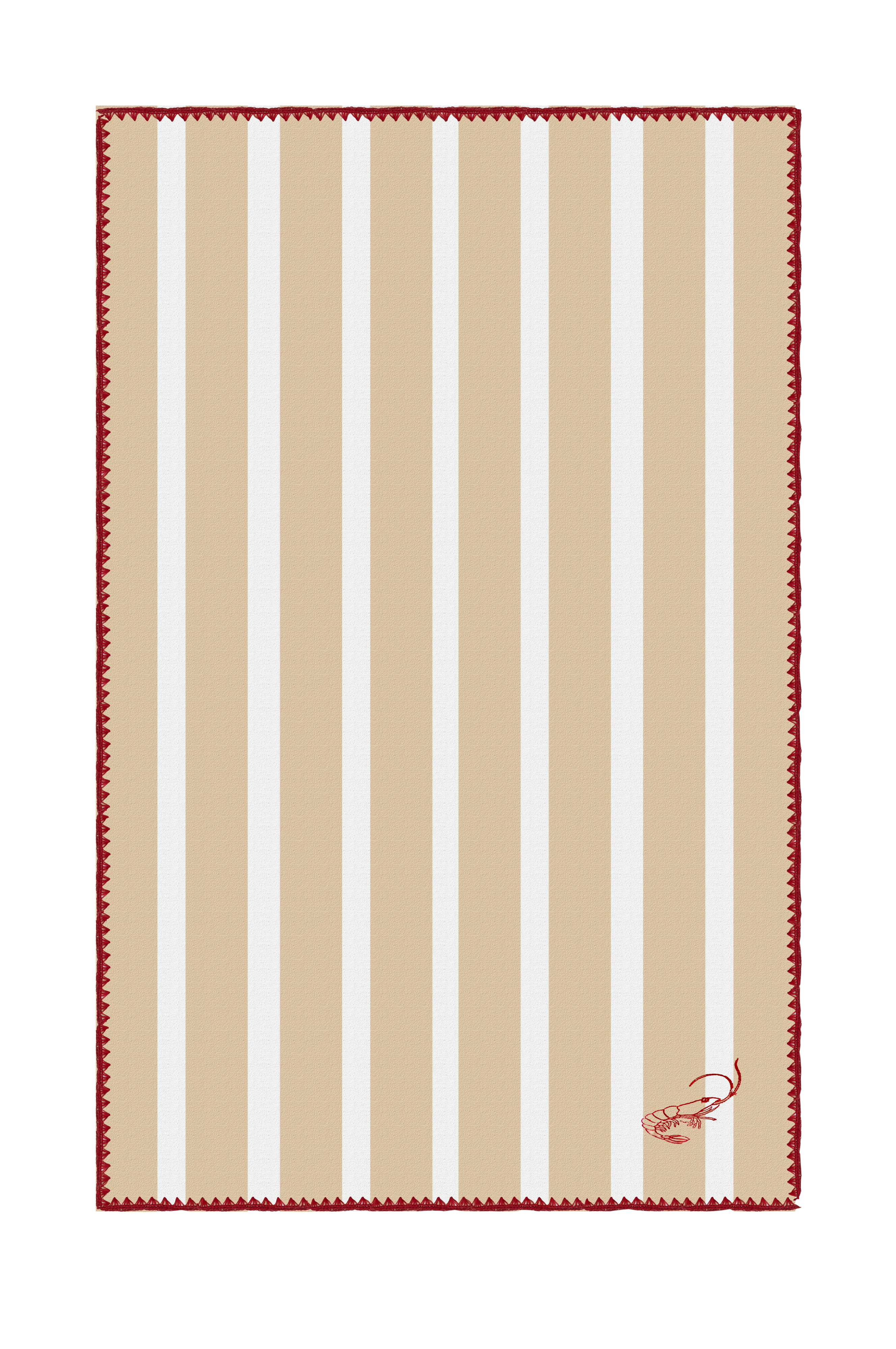 Bubba Pöytäliina tuo mieleen Etelä-Euroopan viehätyksen ja pitkät, kutsuvat illalliset. Tässä pöytäliinassa on klassisia beigen ja valkoisia raitoja, ommeltu reuna, jossa on punainen kontrasti, ja kirjailtu katkarapu leikkisänä yksityiskohtana, ja se tuo viehättävän elementin mihin tahansa pöytään. Yhdistä se saman sarjan lautasliinojen ja teepyyhkeiden kanssa yhtenäisen ja tyylikkään kattauksen luomiseksi. Valmistettu 70 % kierrätetystä puuvillasta ja 30 % kierrätetystä polyesteristä. Mitat: 150x280 cm. Mukana nauha ja rusetti. Suunnittelija: Byon Studio.