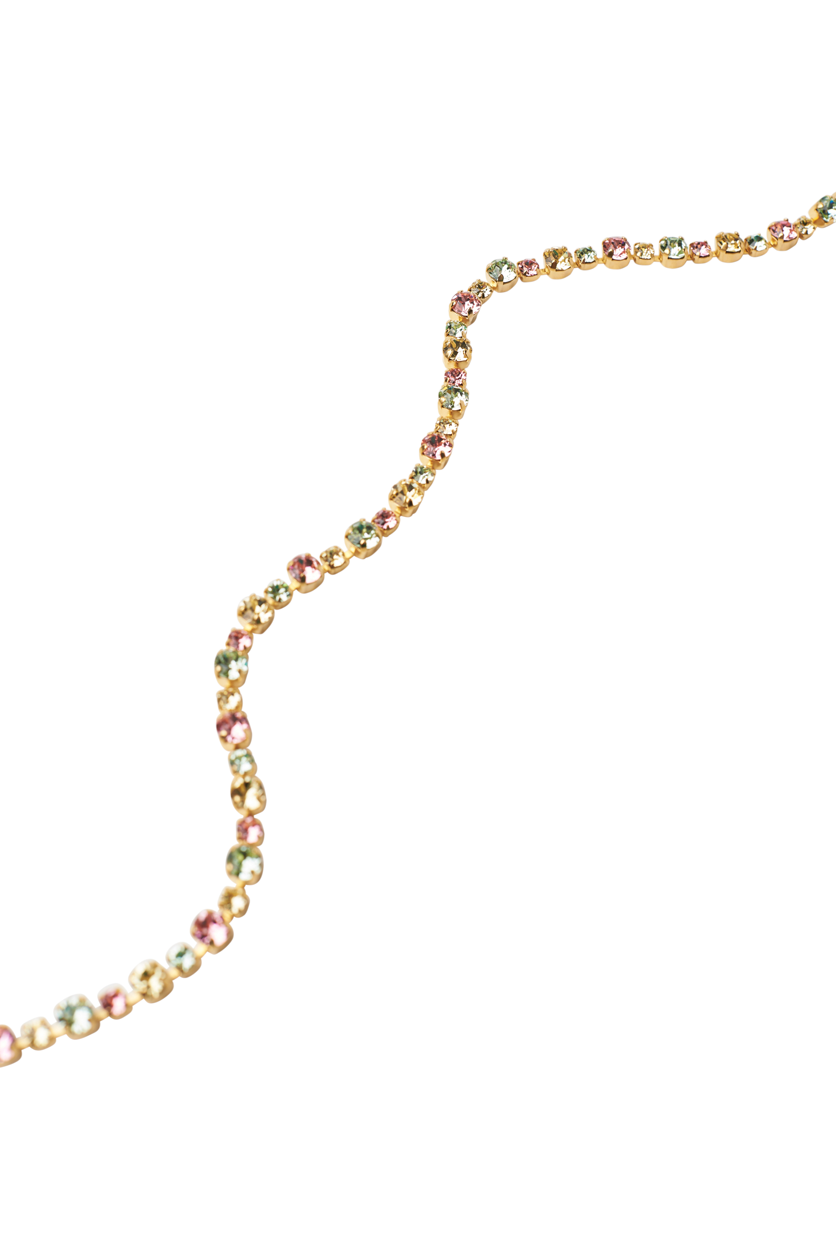 Kaulakoru, jossa erivärisiä ja erikokoisia kimaltavia kiviä. Säädettävä pituus n. 41-45 cm.