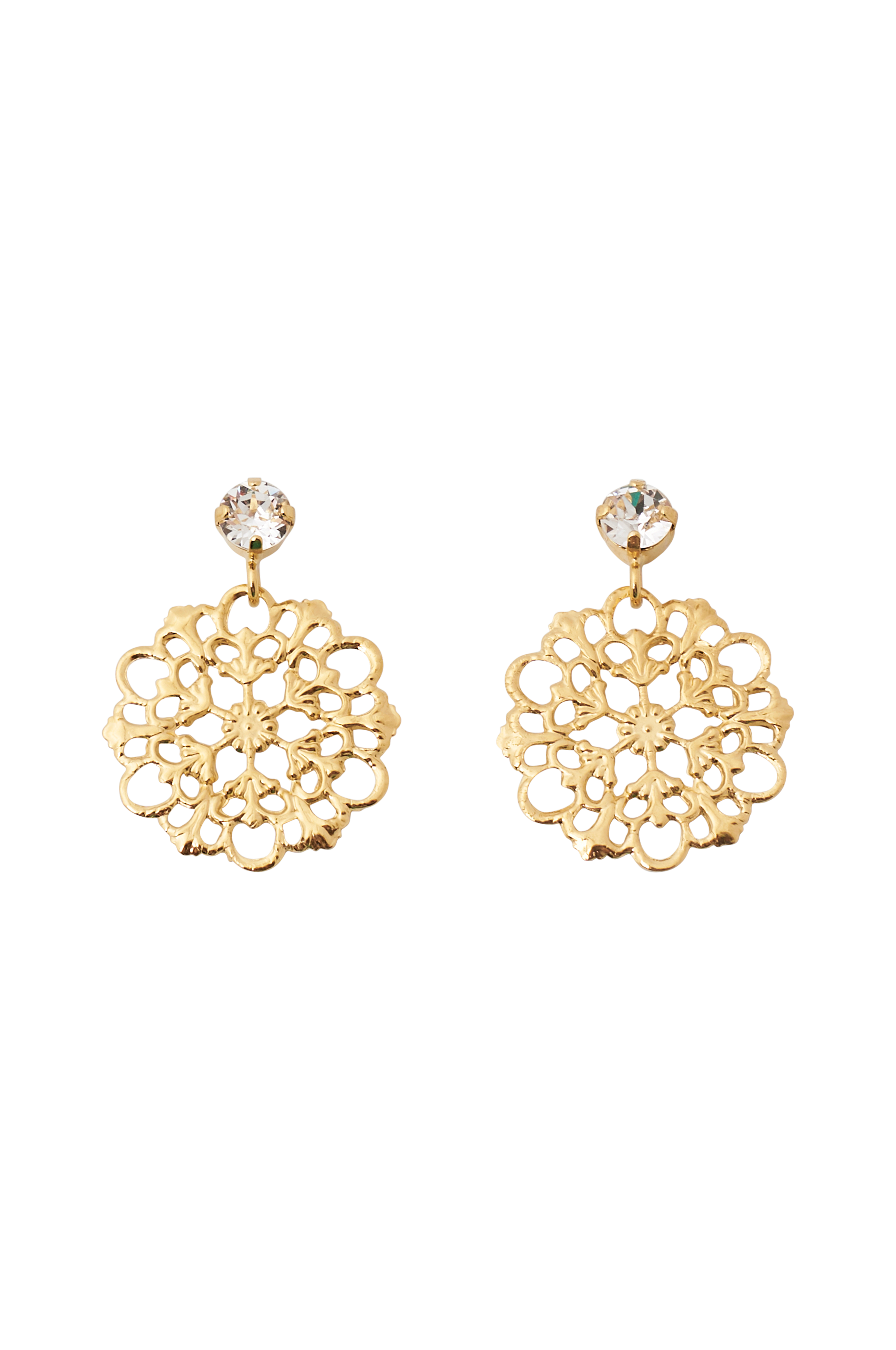 Naisellinen kukkamuotoilu ja kimalteleva kristalli. Halkaisija n. 2,5 cm.