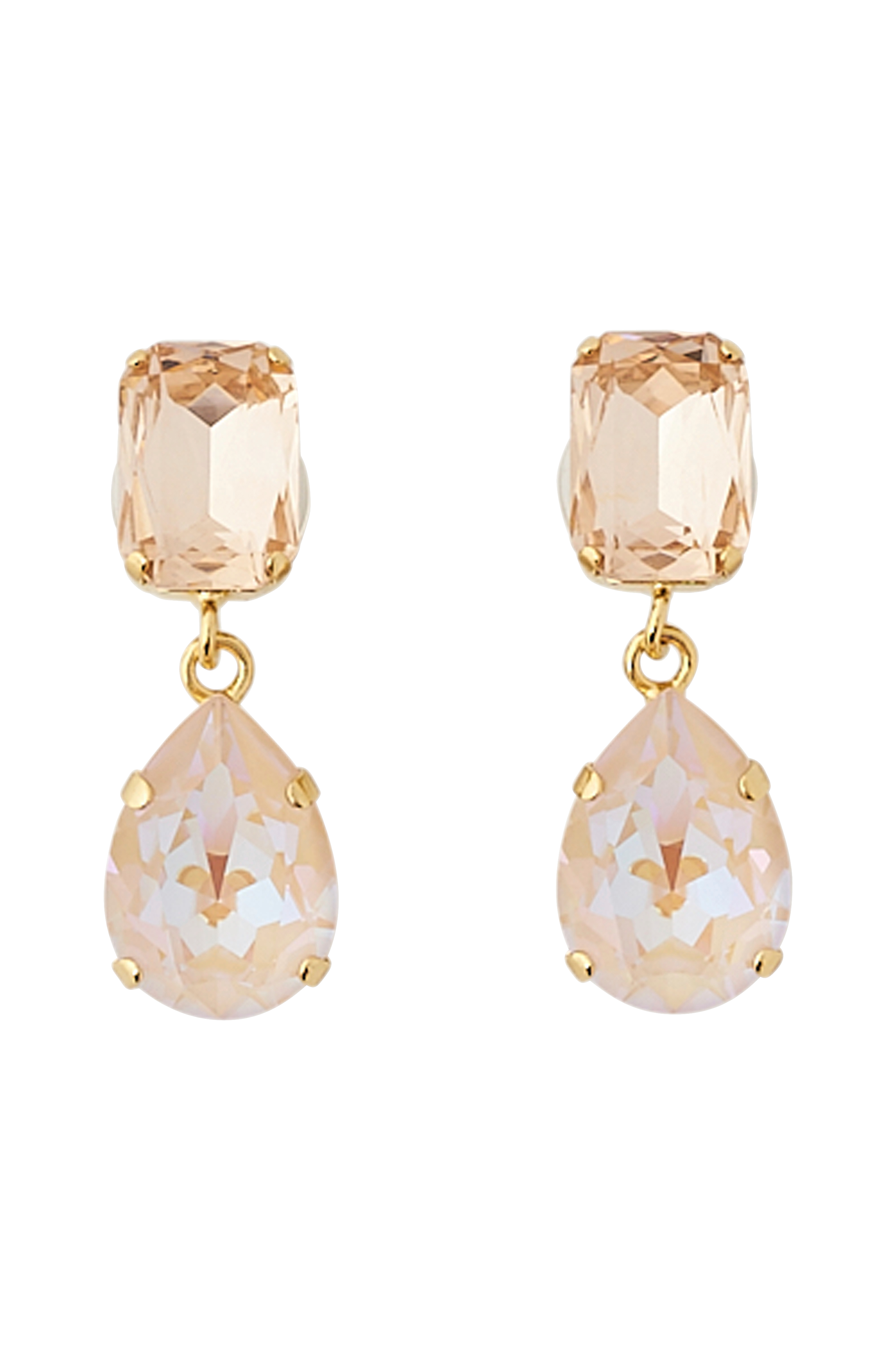 Korvakorut, joissa pisaranmuotoiset kristallit. Koko 35x13 mm. Valmistettu messingistä, jossa on 18 karaatin kultapäällyste.