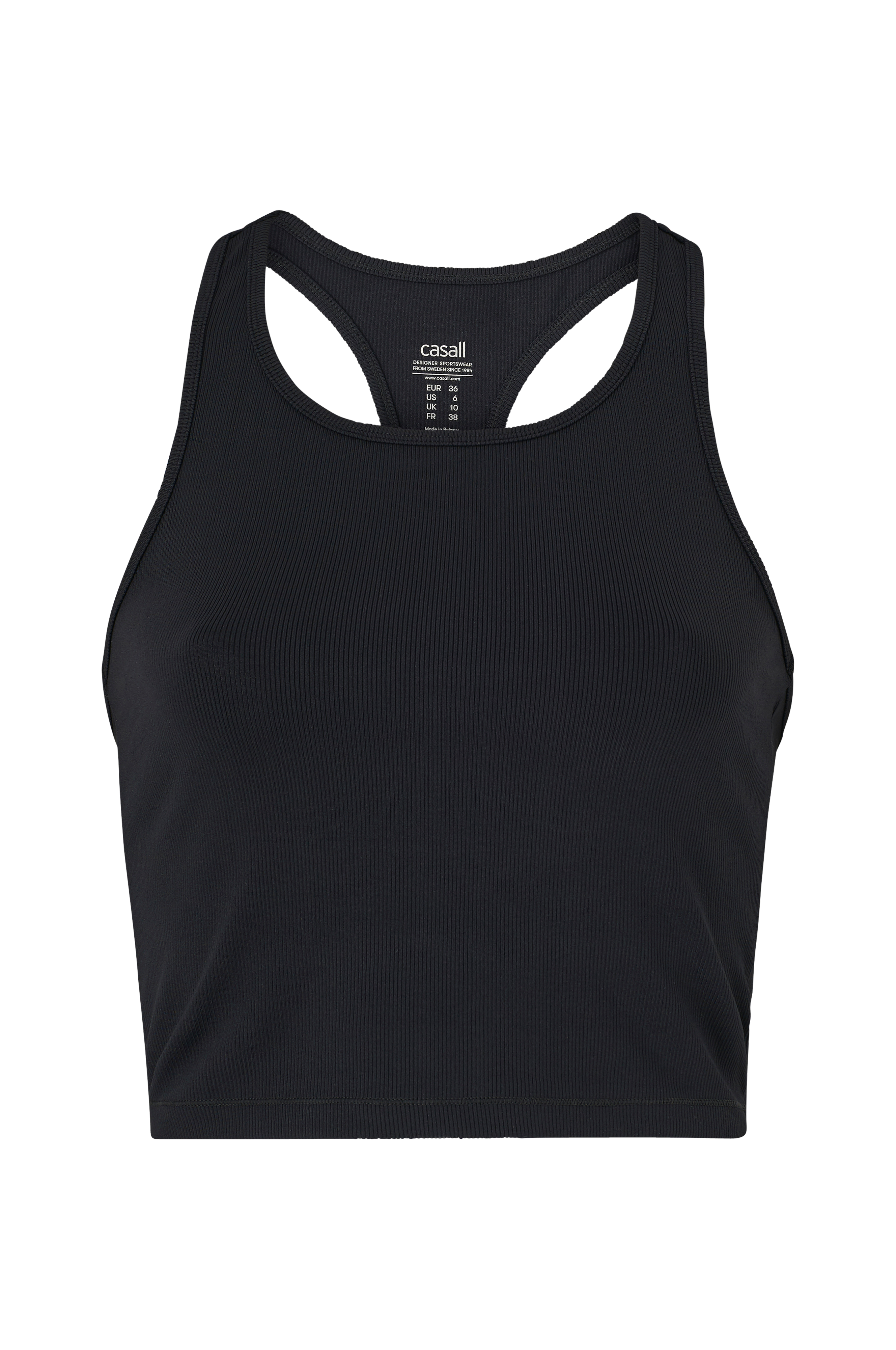 Casall Bold Rib Crop Tank -treenitoppi. Lyhyt malli. Pehmeää joustinneulostrikoota, joka kuivuu nopeasti ja jolla on hyvät kosteutta siirtävät ominaisuudet. Painijanselkä.