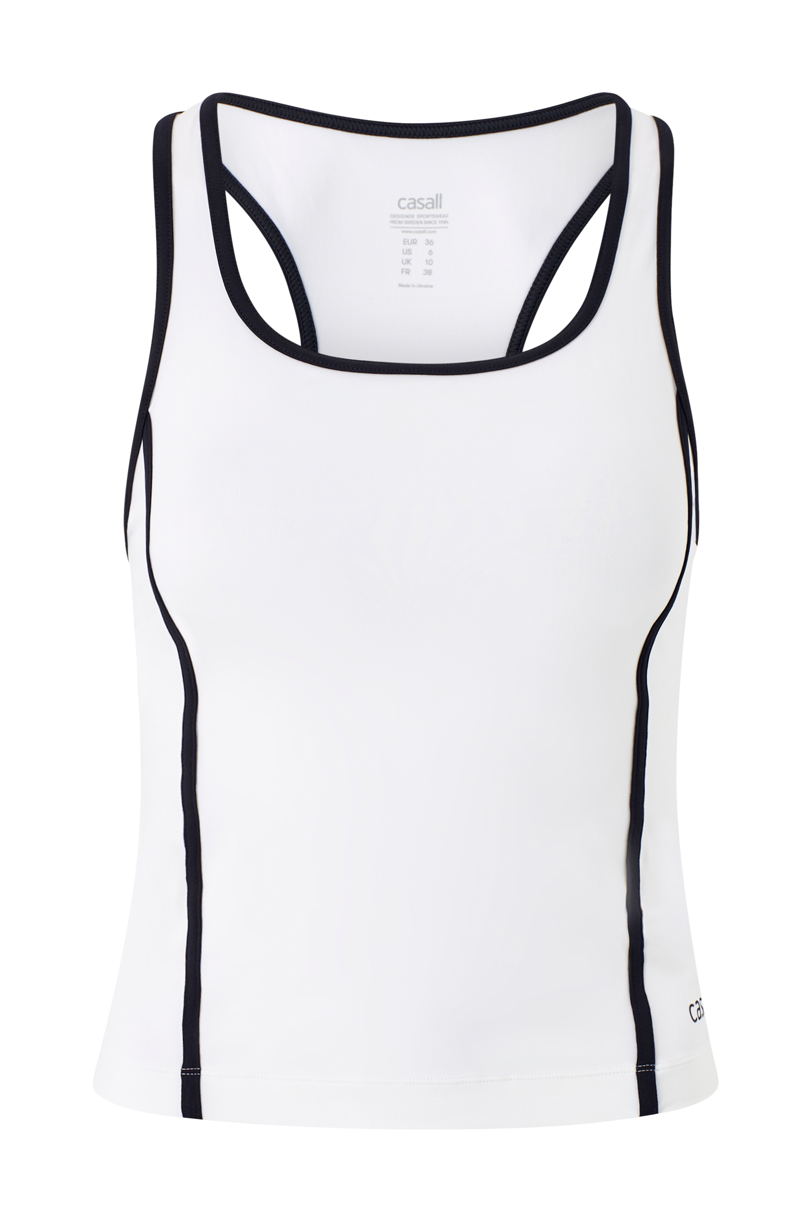 Treenitoppi, jossa nelikulmainen pääntie ja sporttiset kontrastiväriset raidat. Suunniteltu mailaurheiluun. Valmistettu pehmeästä, kierrätetystä teknisestä materiaalista, joka siirtää tehokkaasti kosteutta pois korkean intensiteetin harjoittelun aikana. Kapea istuvuus ja painijanselkä.