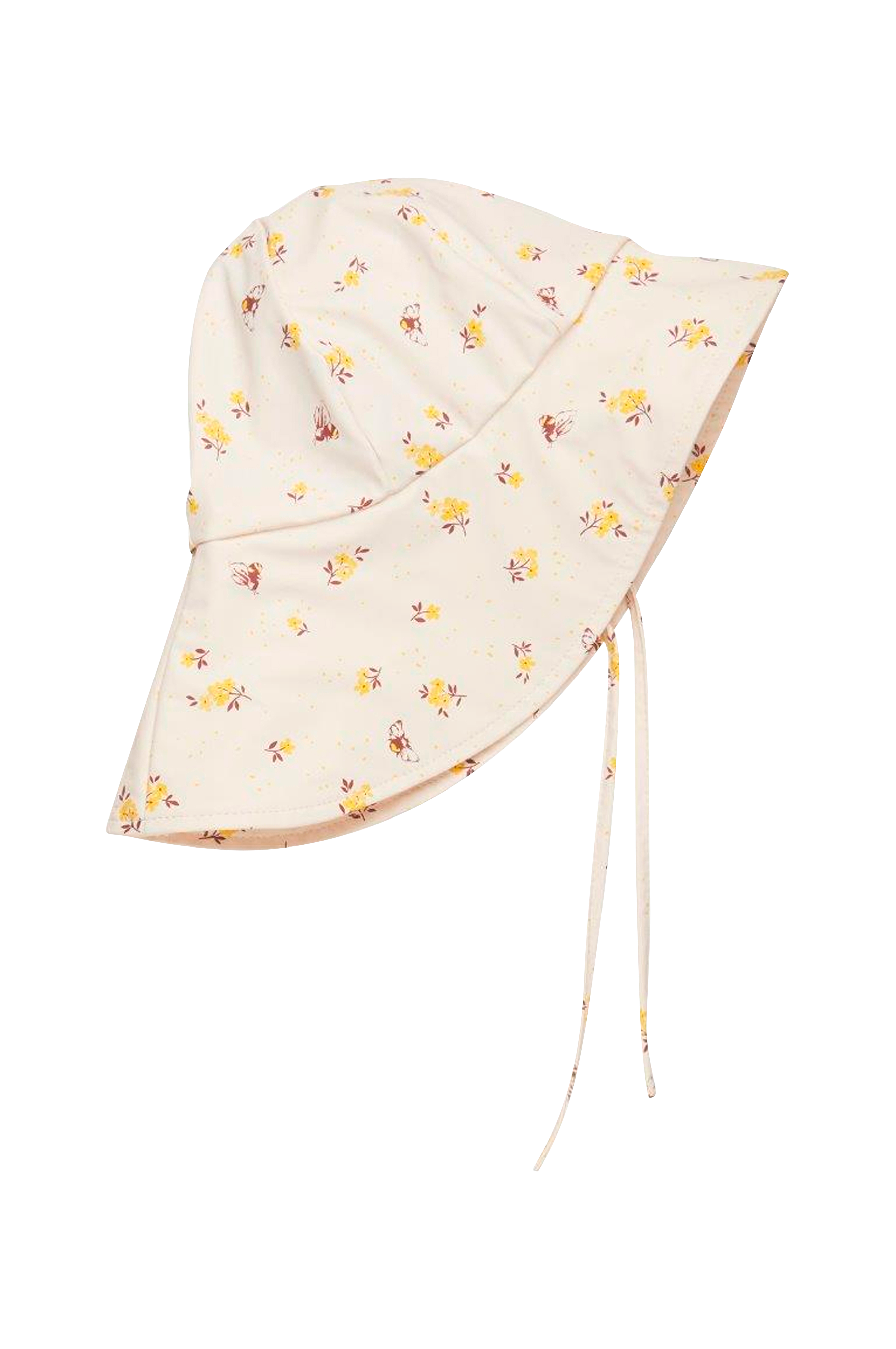 Kuviollinen sadehattu, jossa leuan alta solmittavat nauhat.
