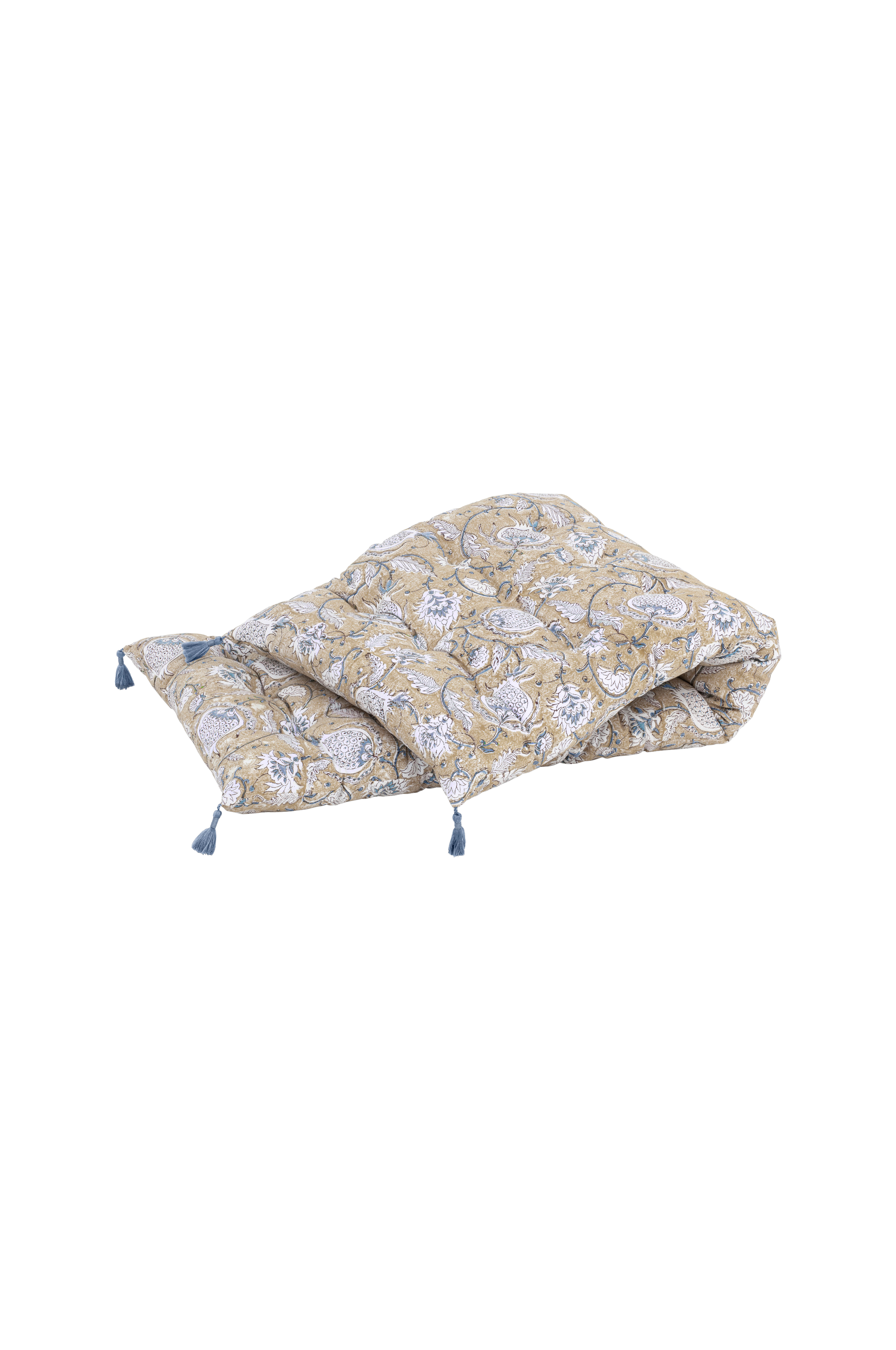 Istuintyyny, jossa kaunis kuvio ja koristeelliset tupsut. Saatavana useita kokoja. Kuvio on painettu käsin perinteisellä blockprint-tekniikalla.