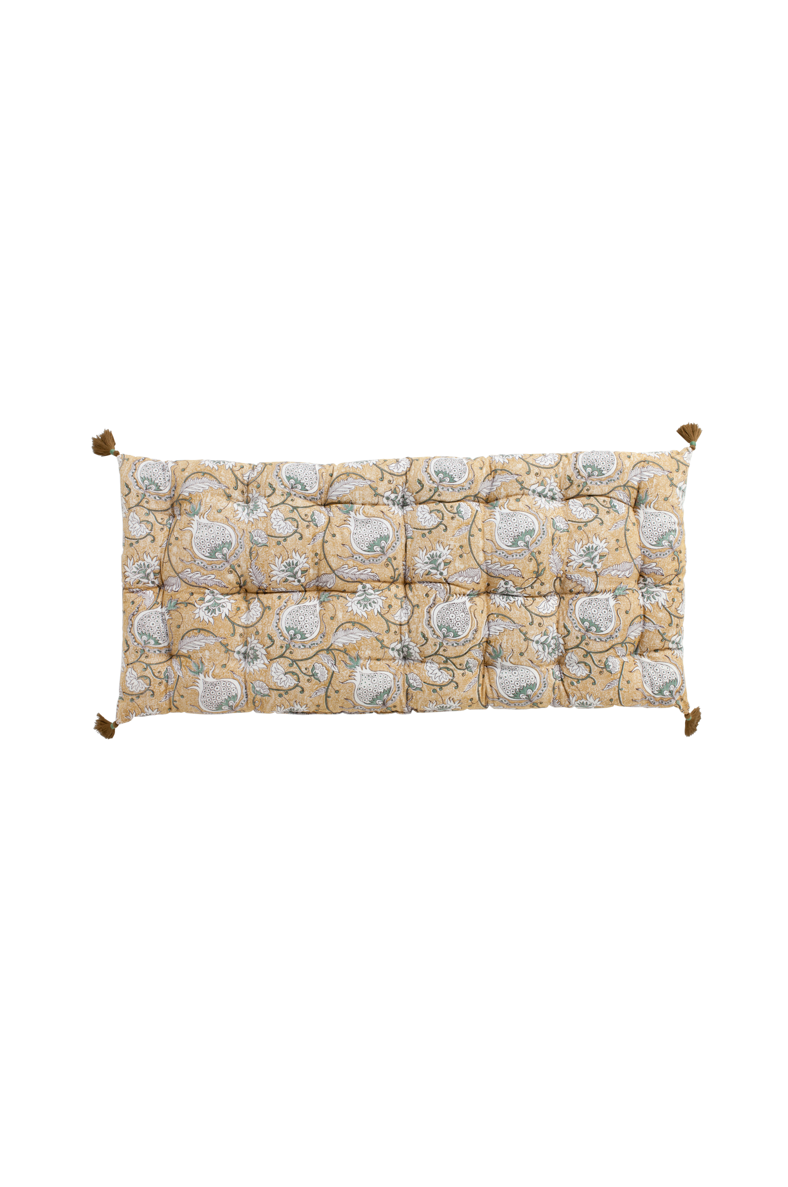 Kuviollinen Chamois-tuotemerkin istuintyyny, jossa koristehapsut. Käsinpainettu kuvio, joka on tehty perinteisellä intialaisella blockprint-tekniikalla. Ainutlaatuista käsityötä, joka antaa pöytäliinalle elävän ja koristeellisen ilmeen.