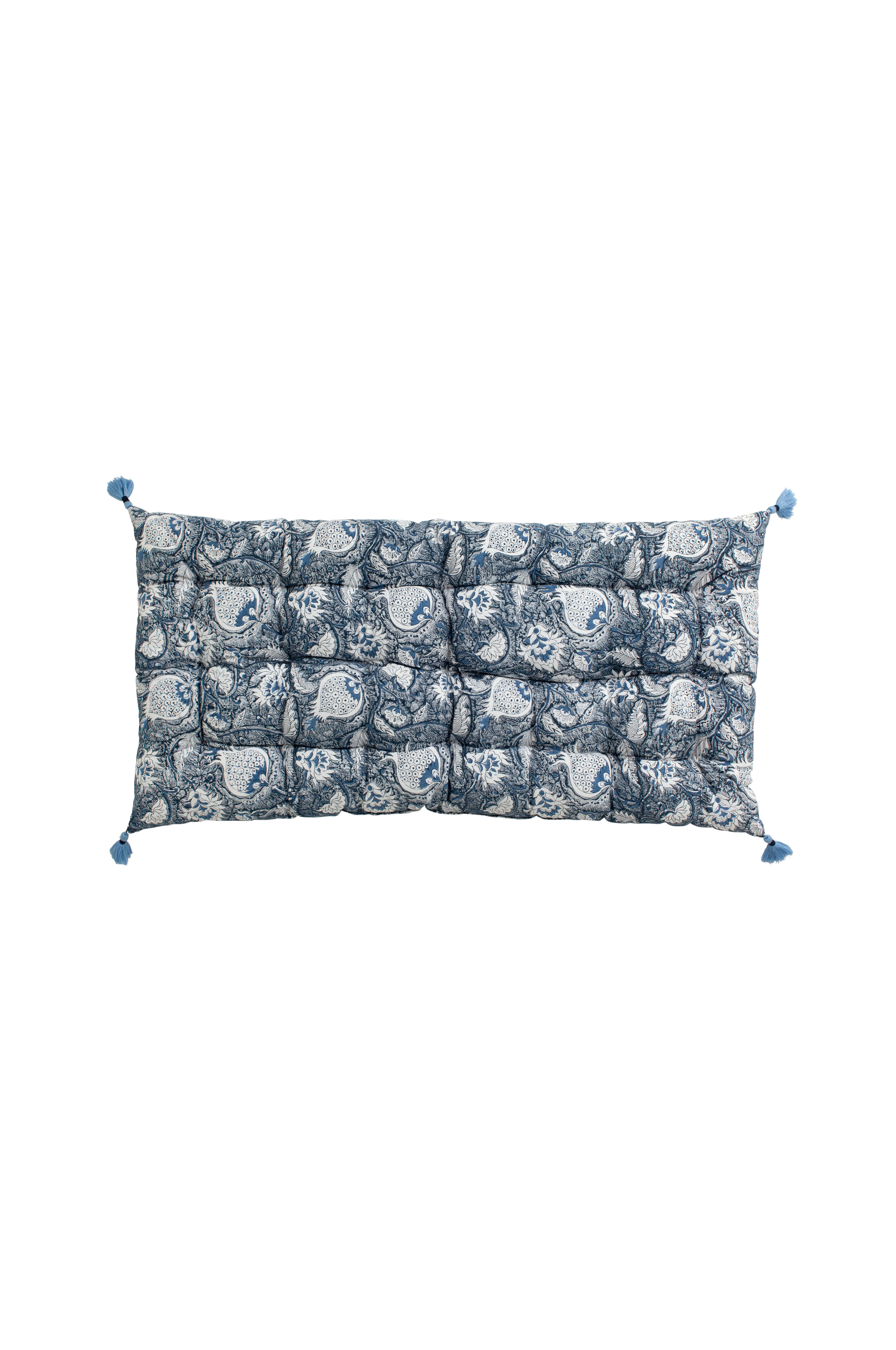 Kuviollinen Chamois-tuotemerkin istuintyyny, jossa koristehapsut. Käsinpainettu kuvio, joka on tehty perinteisellä intialaisella blockprint-tekniikalla. Ainutlaatuista käsityötä, joka antaa pöytäliinalle elävän ja koristeellisen ilmeen.